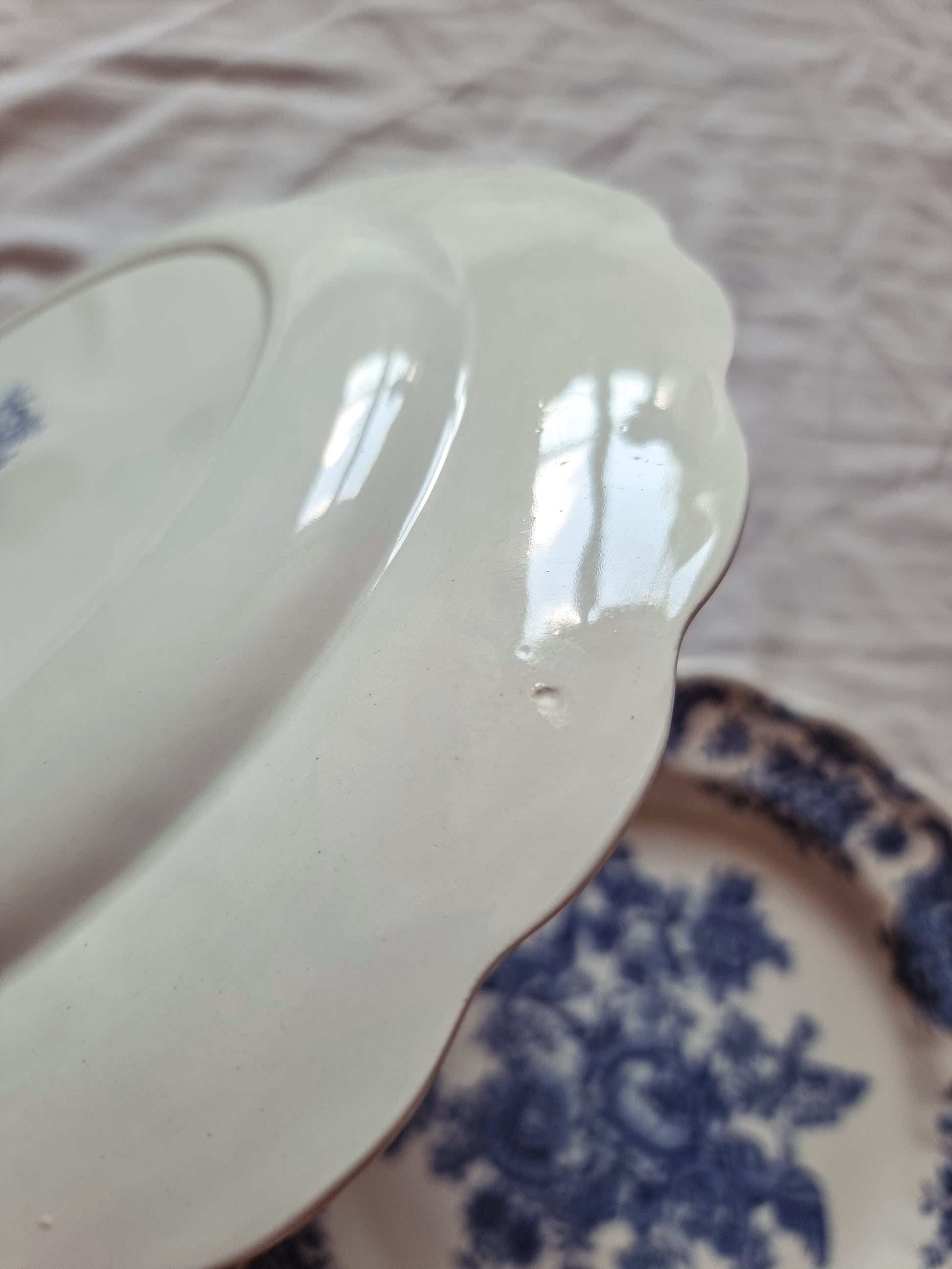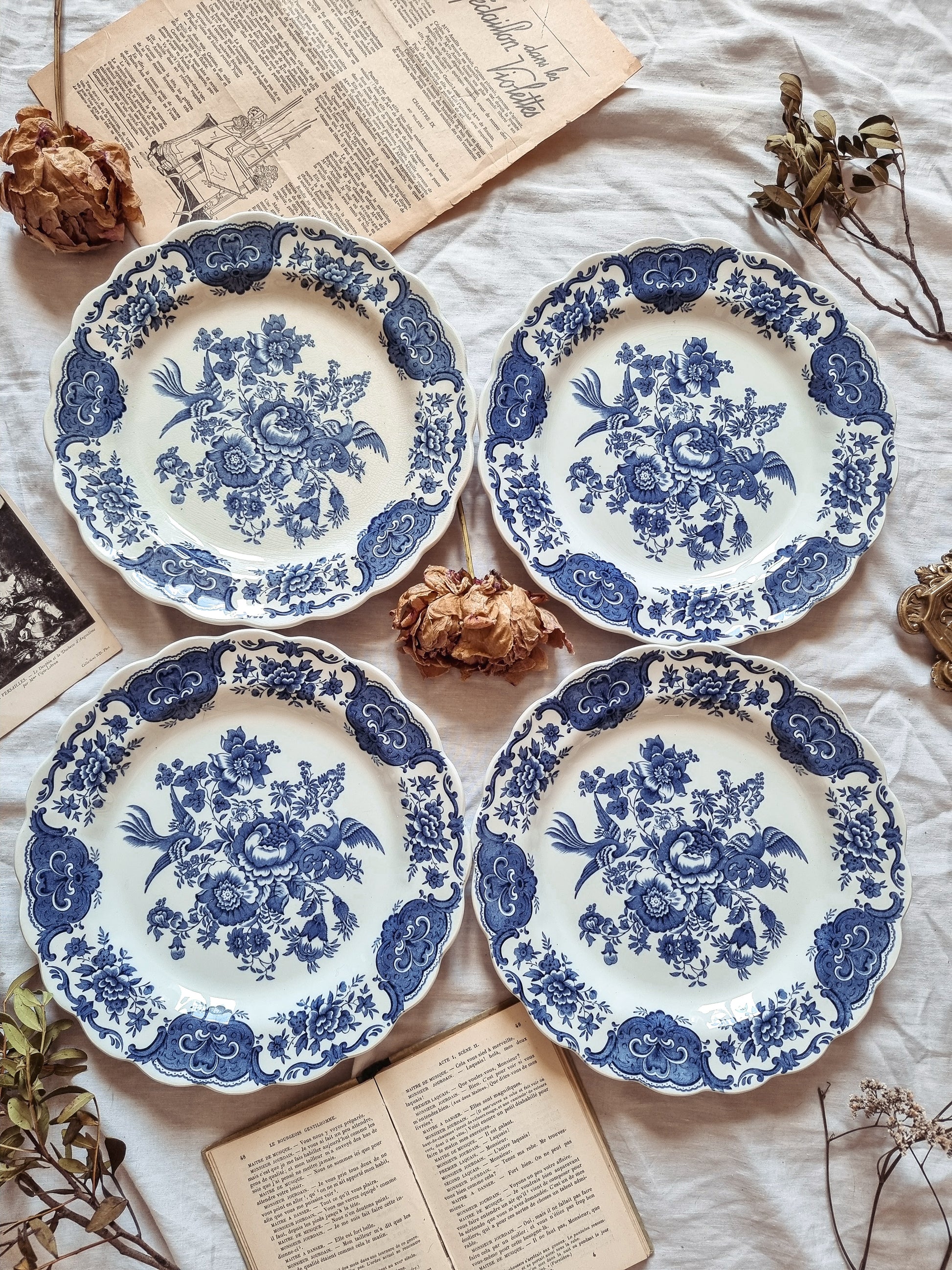 Décor bleu sur blanc représentant deux faisans entourés d'un décor floral.