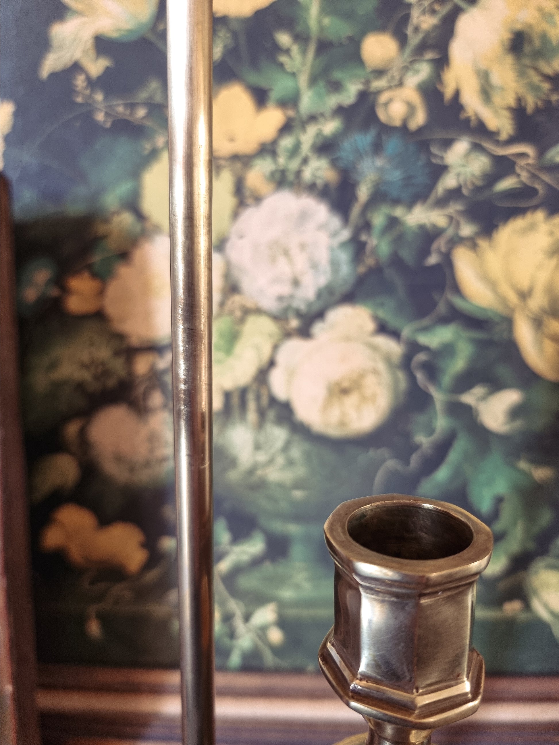 Quelques rayures d'usage sur la tige de l'éteignoir. Celle-ci est également légèrement penchée vers le bougeoir. Ce sont des traces du temps classiques pour ce type d'objet.
