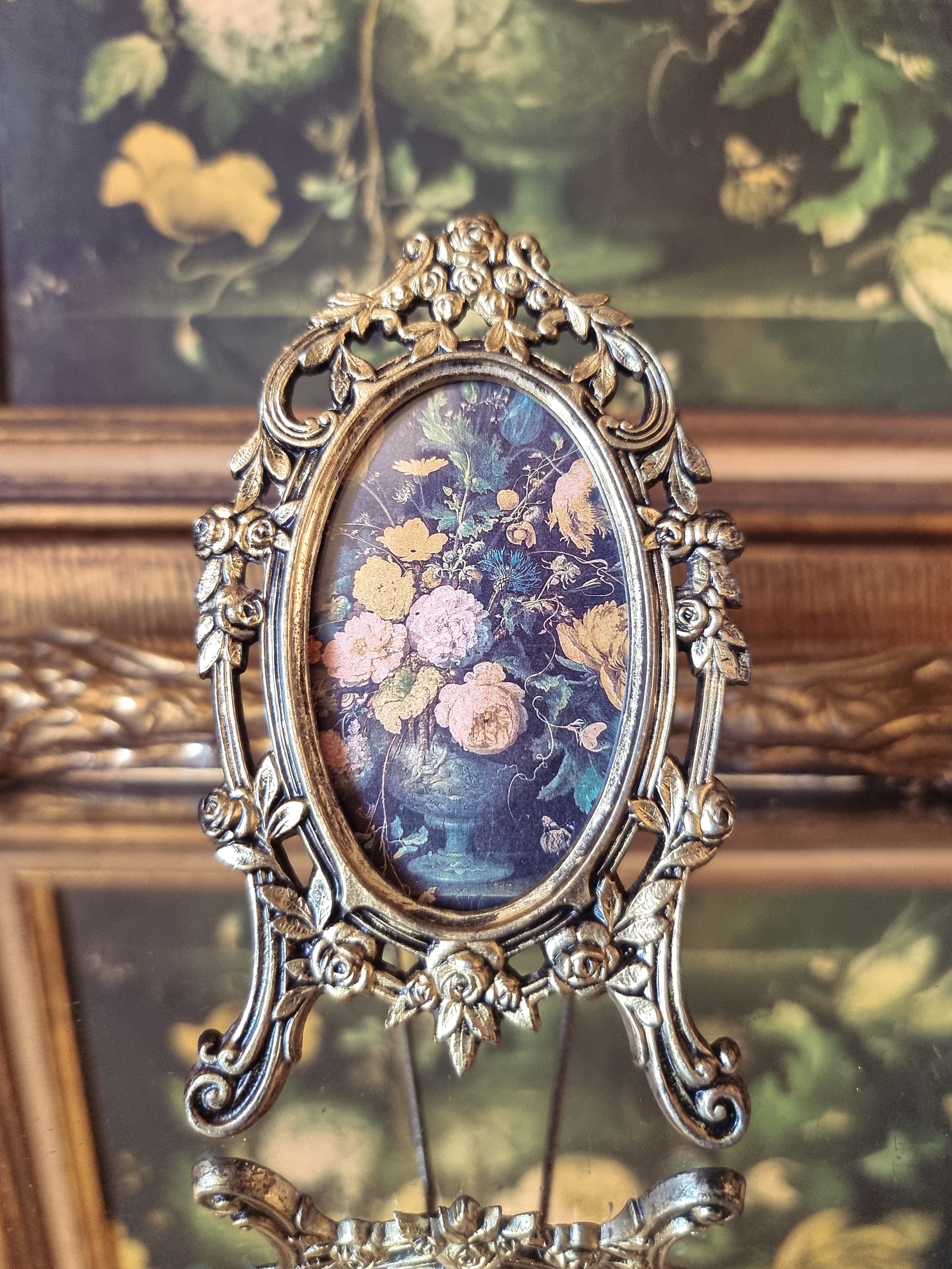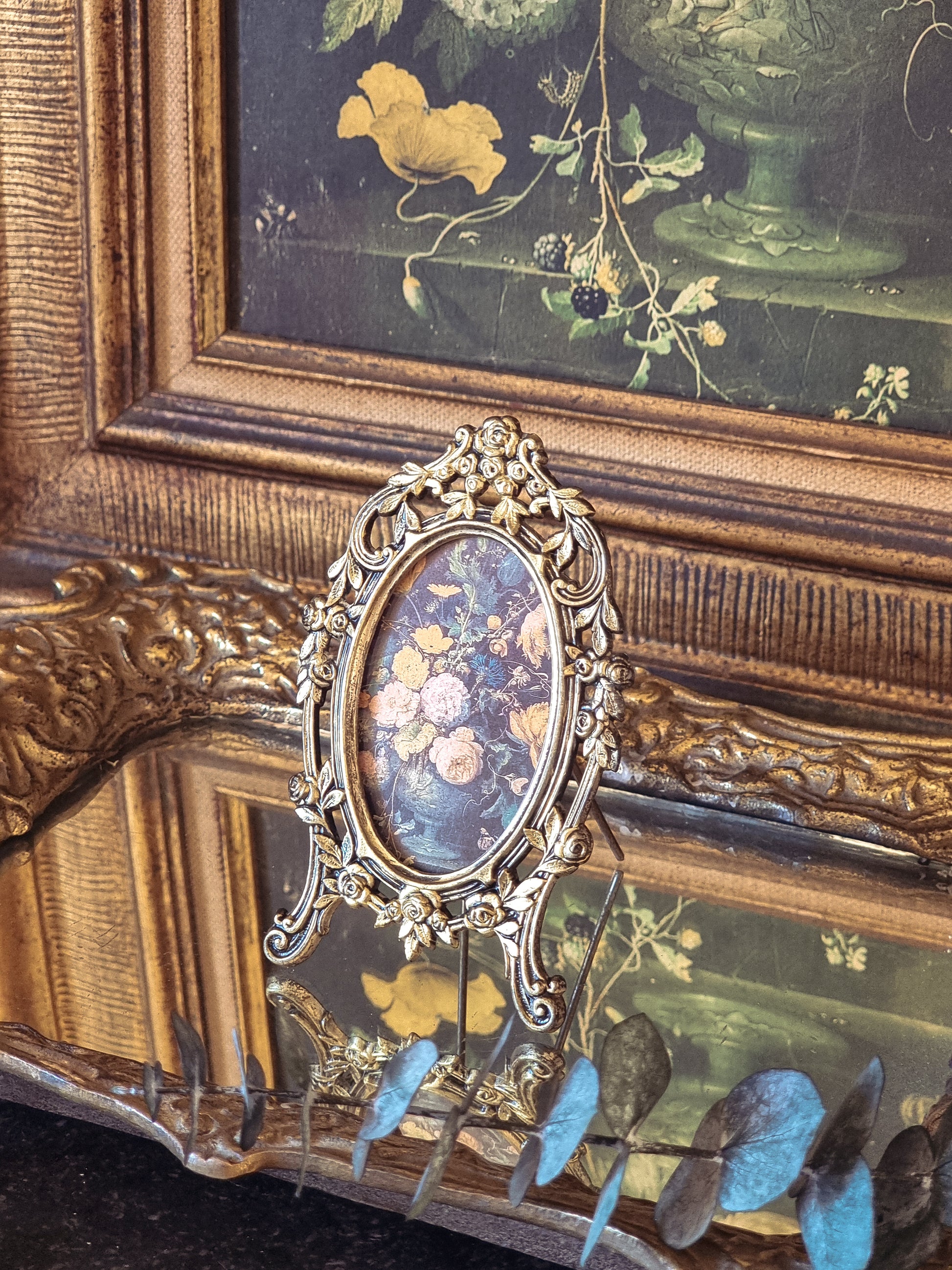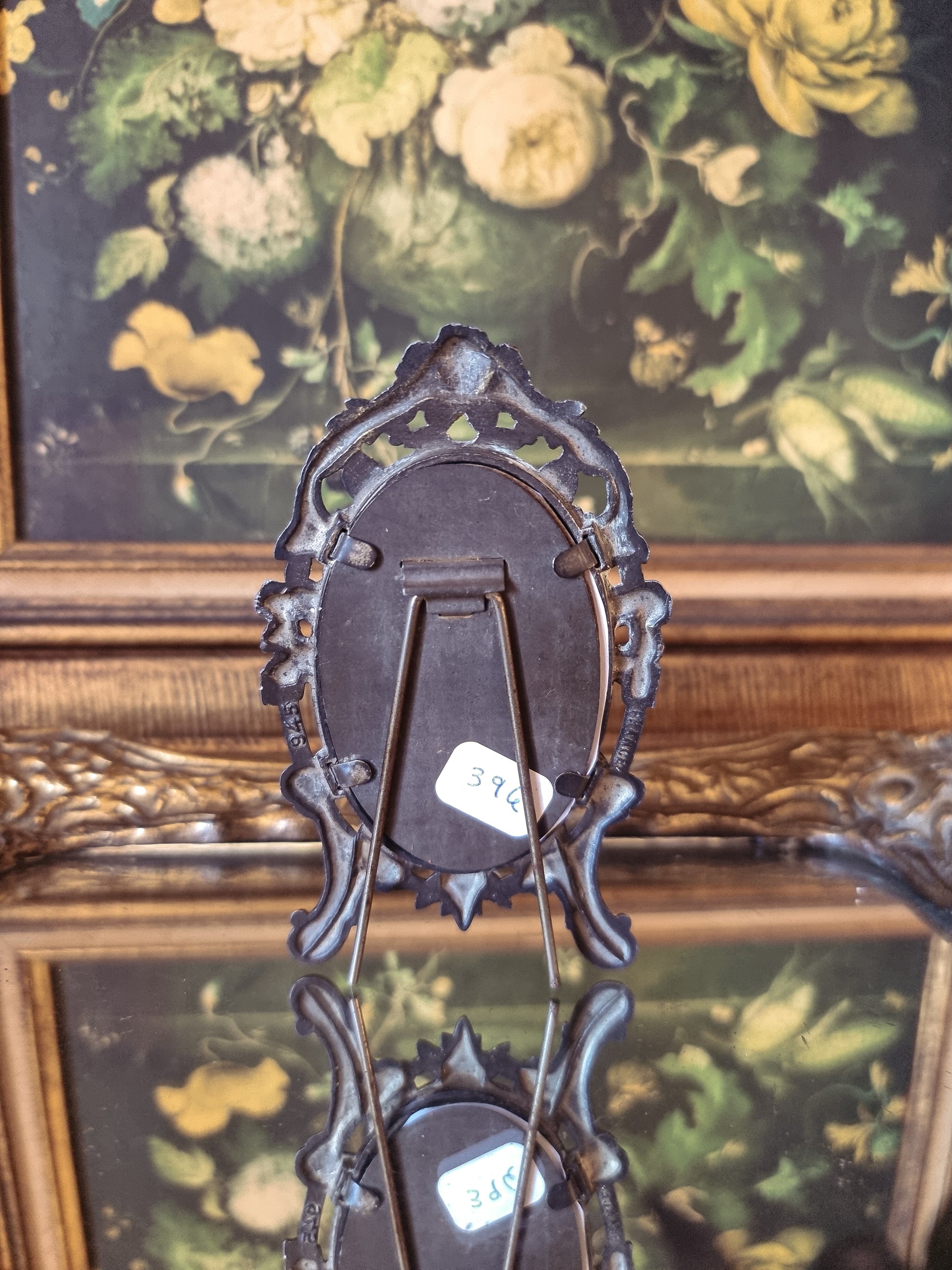 Petit cadre Art Nouveau à poser en régule, doré à la crème à dorer. Début XXe.