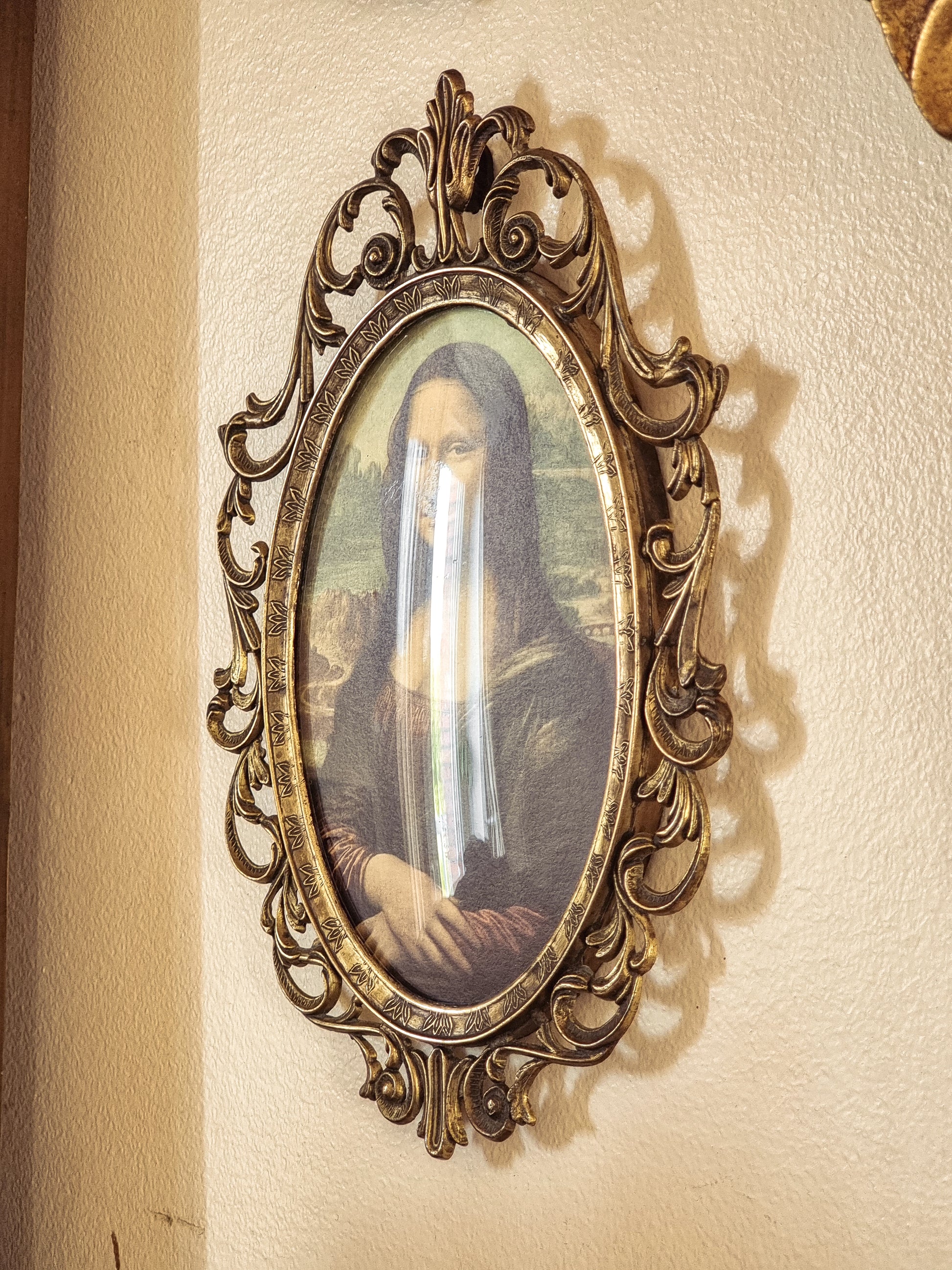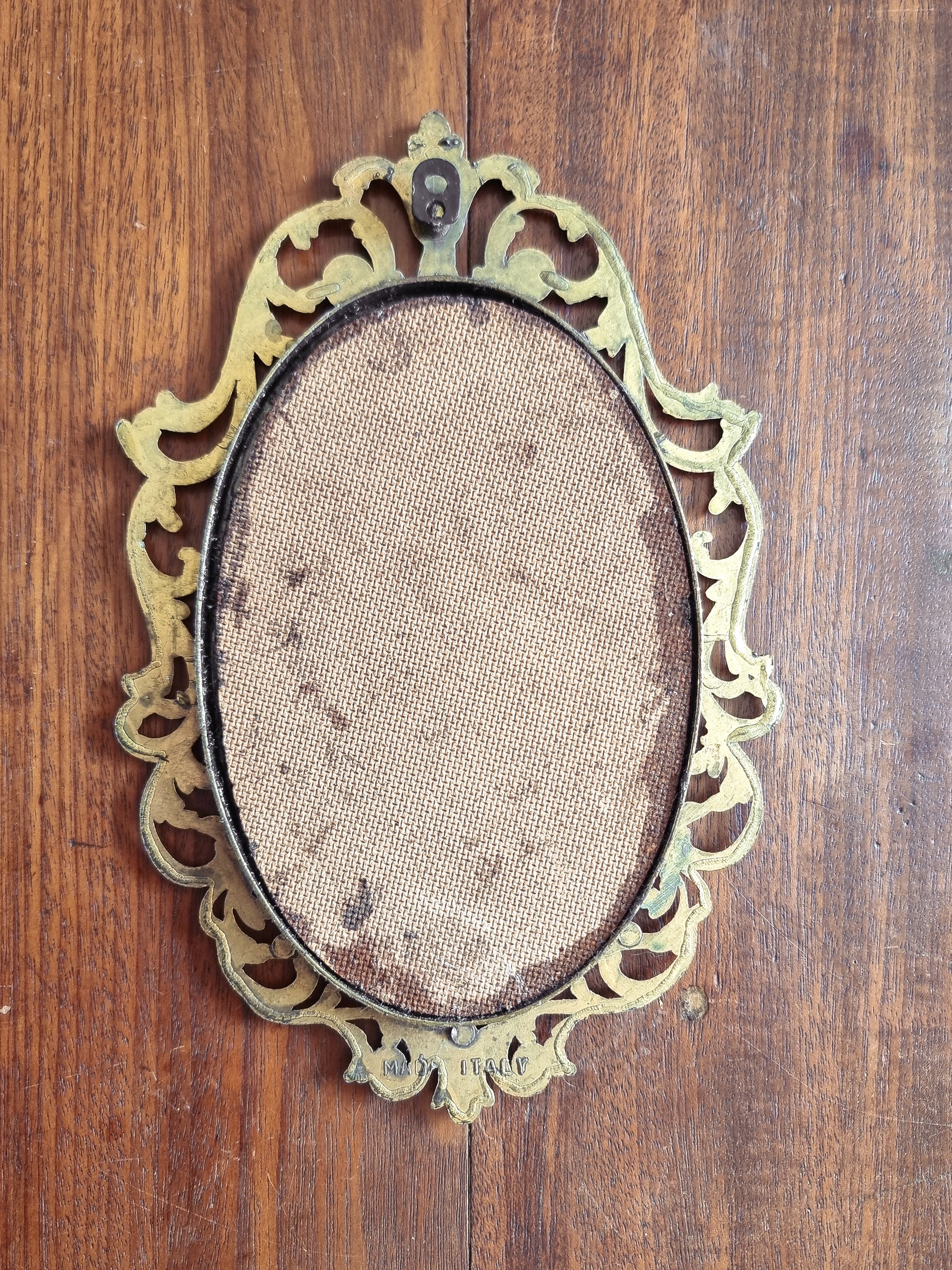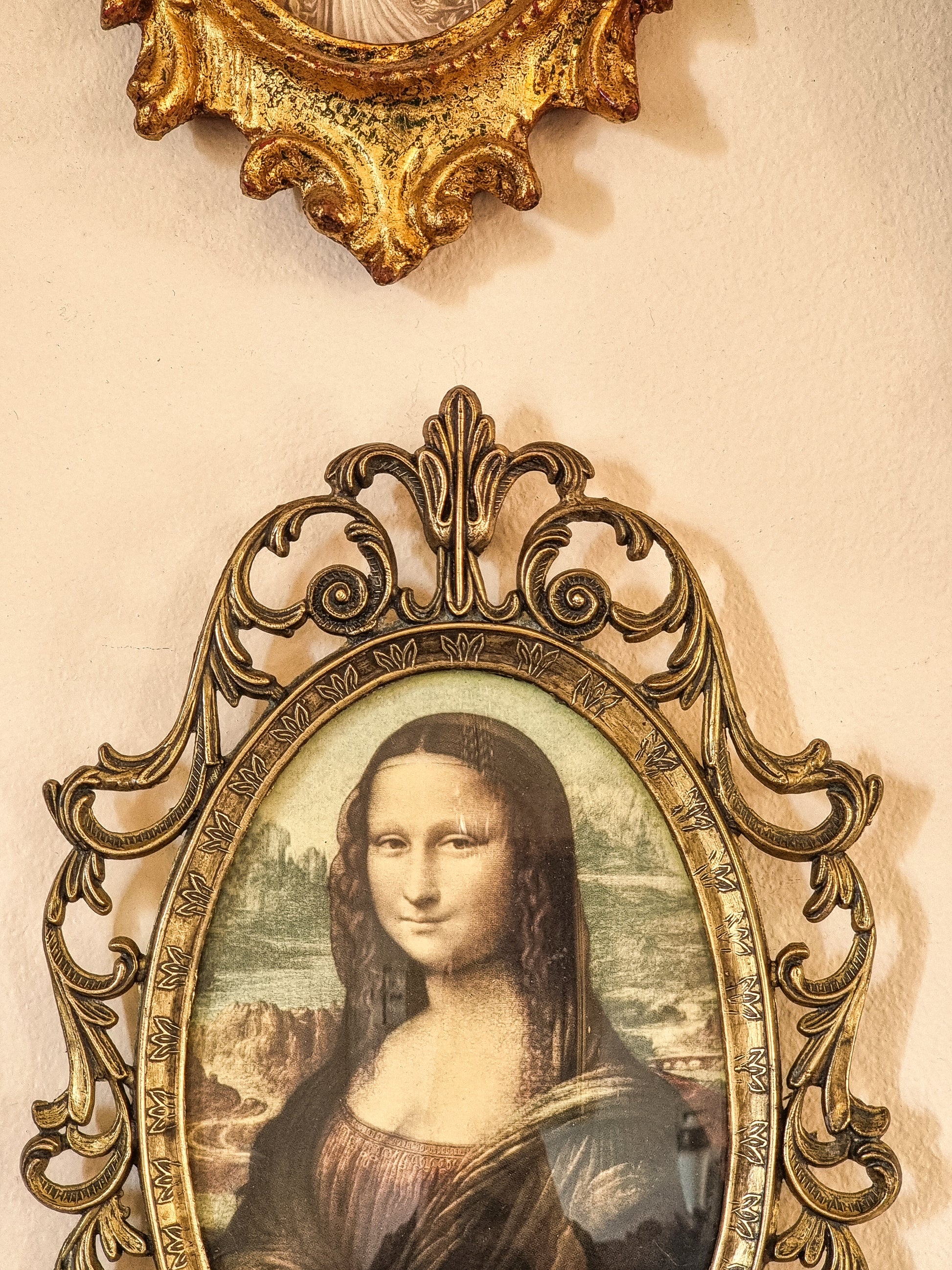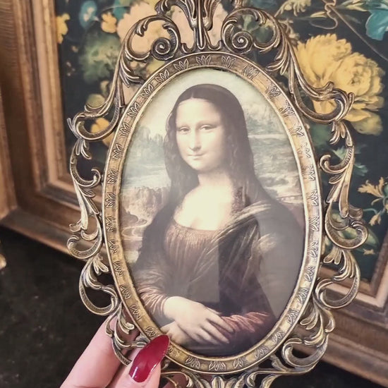 Superbe cadre vintage en métal doré, accompagné de sa reproduction de La Jonconde de Léonard De Vinci.