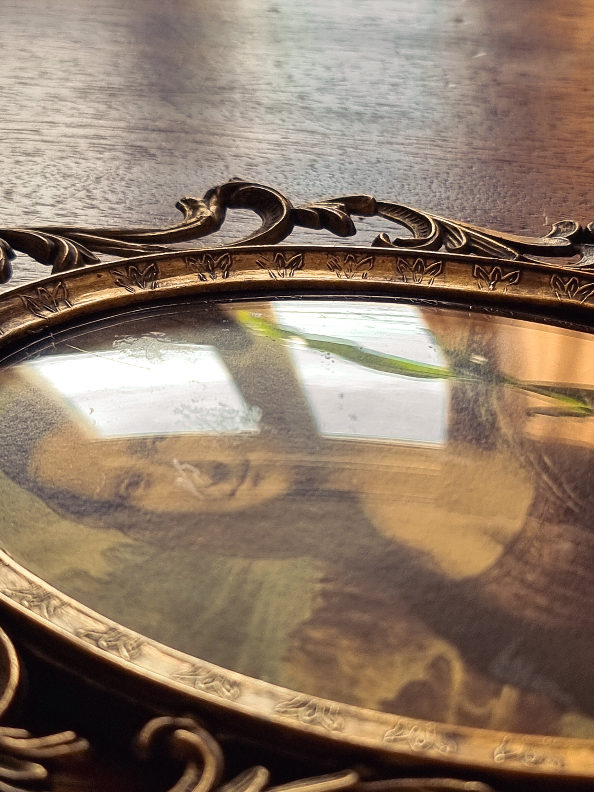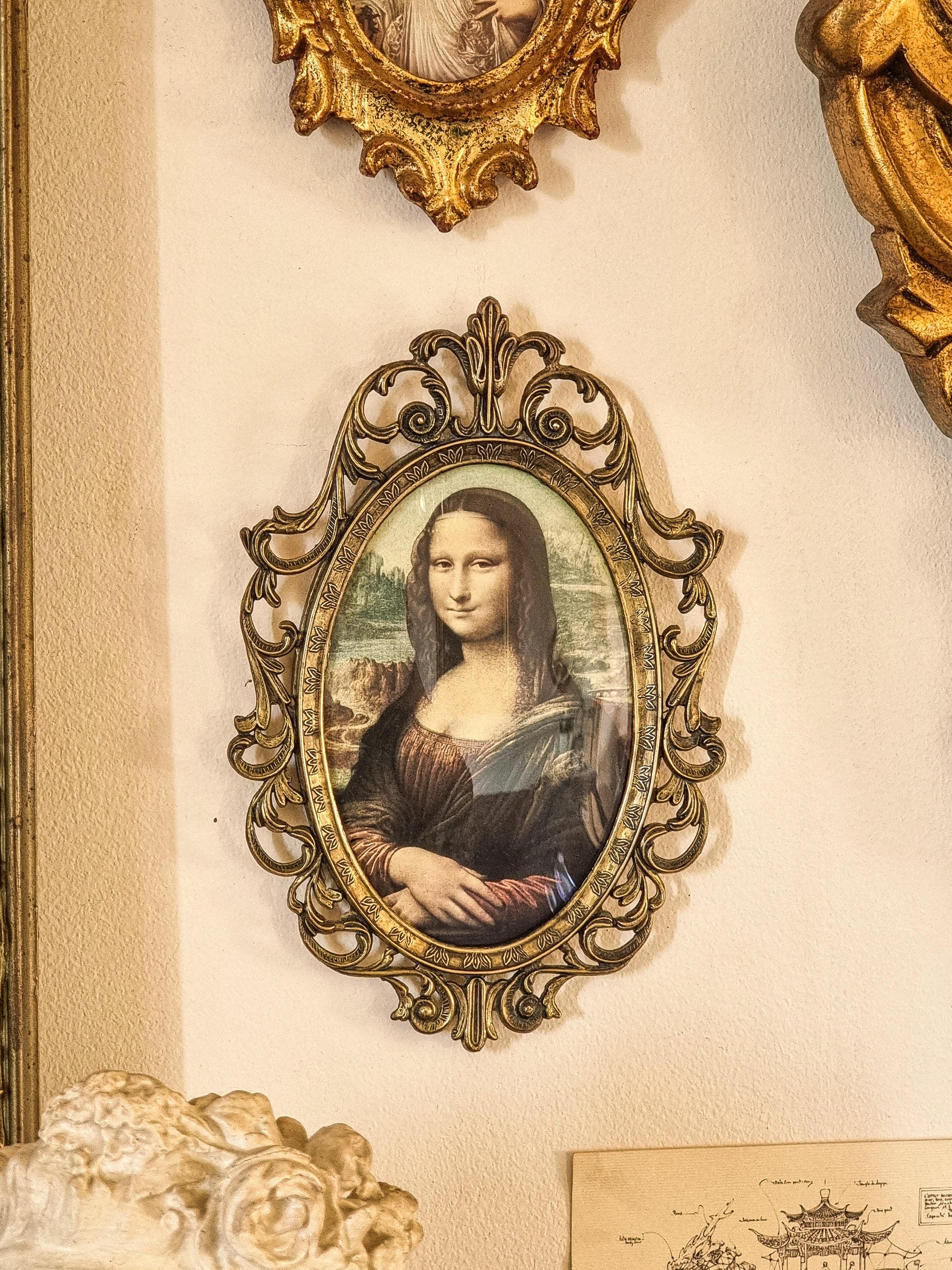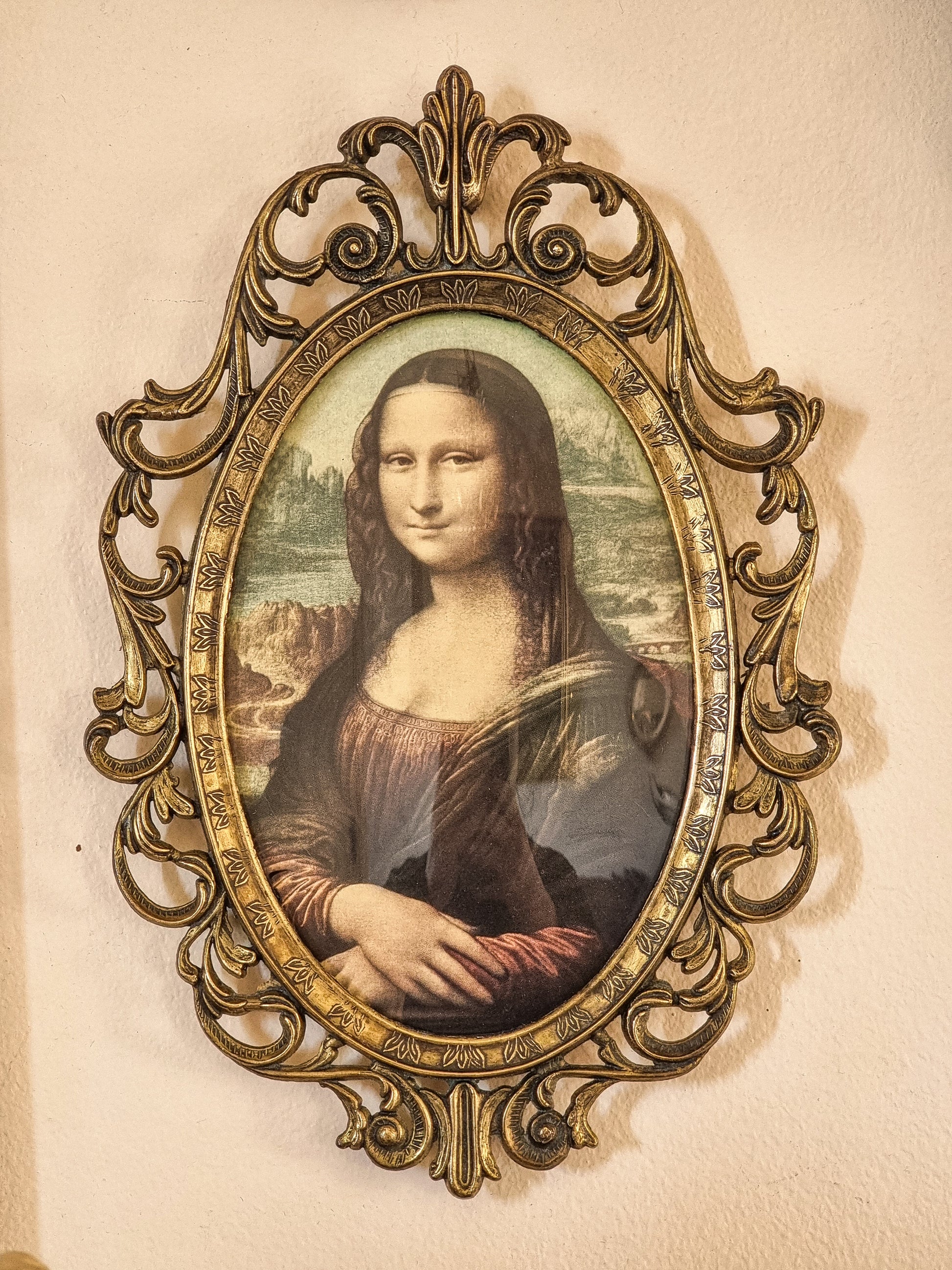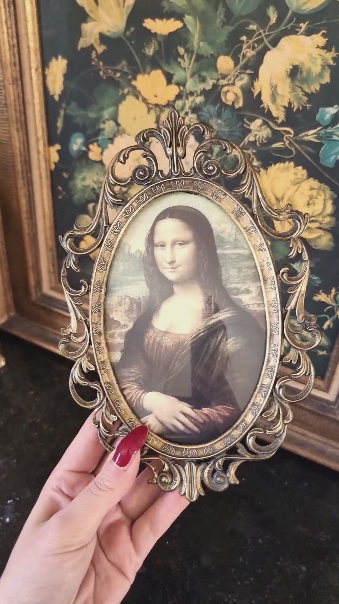 Superbe cadre vintage en métal doré, accompagné de sa reproduction de La Jonconde de Léonard De Vinci.