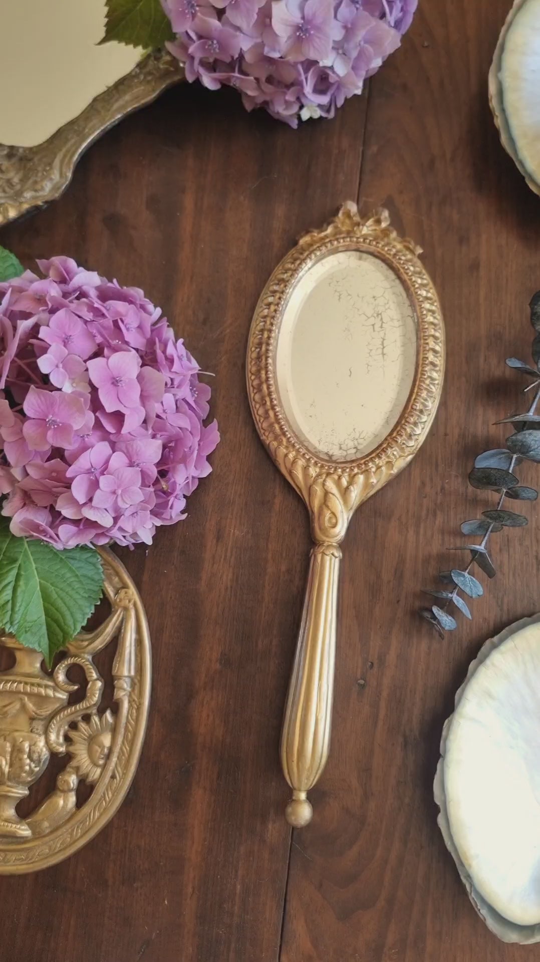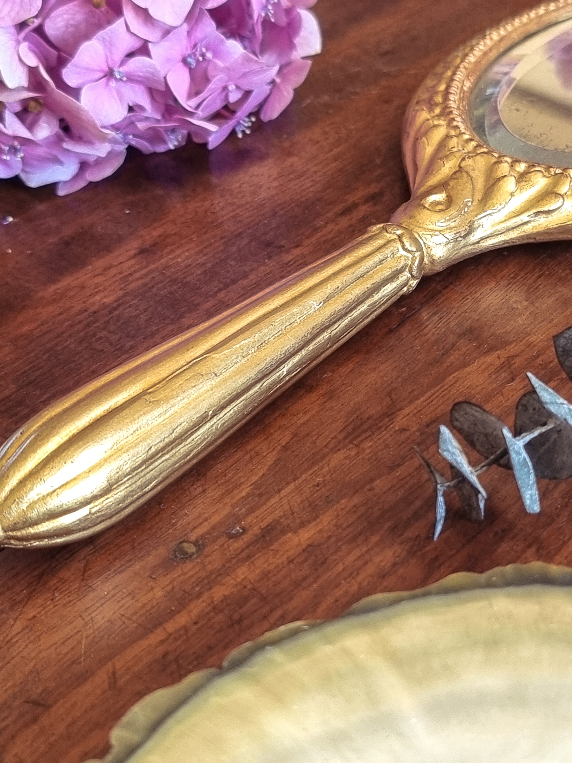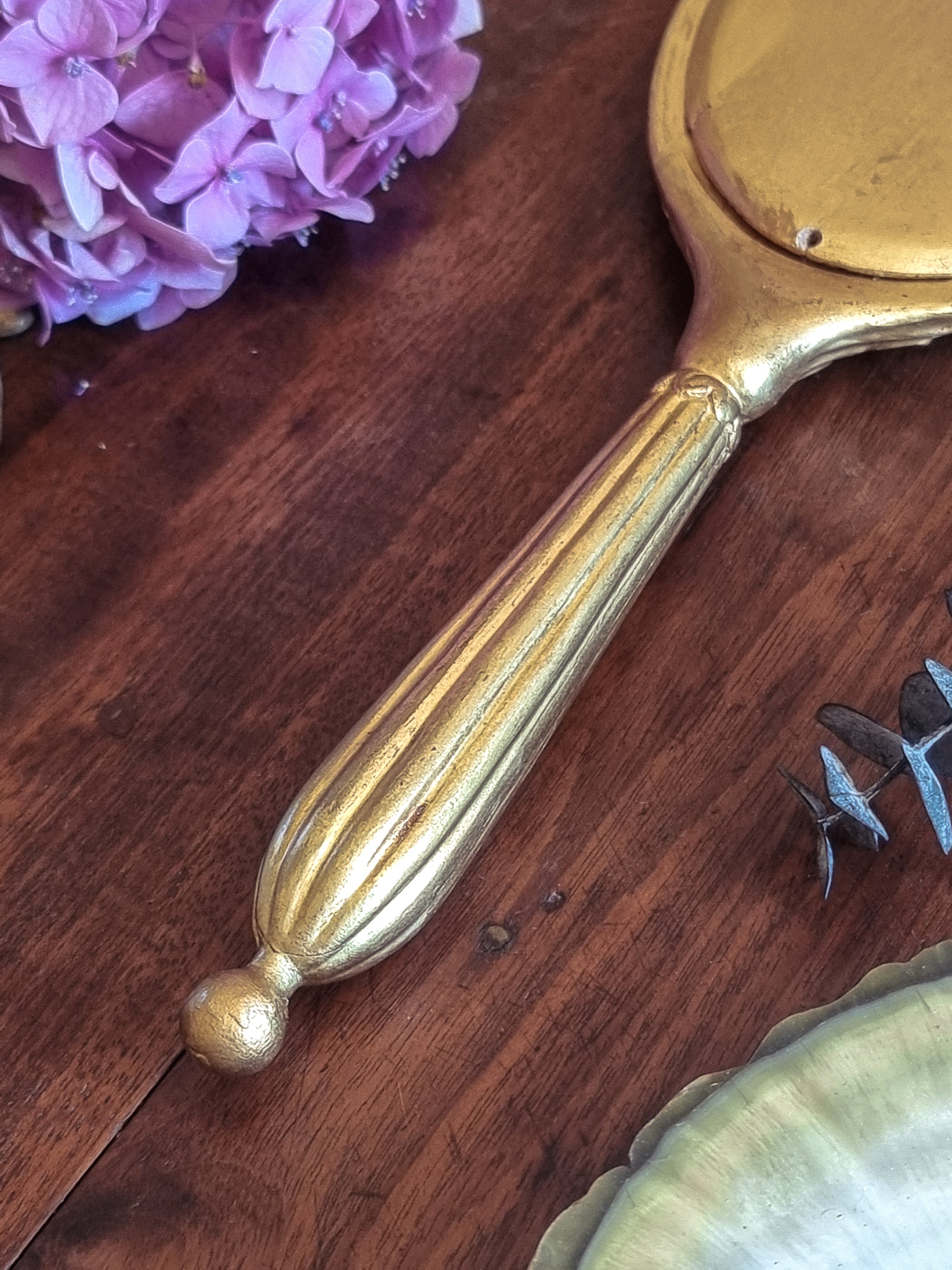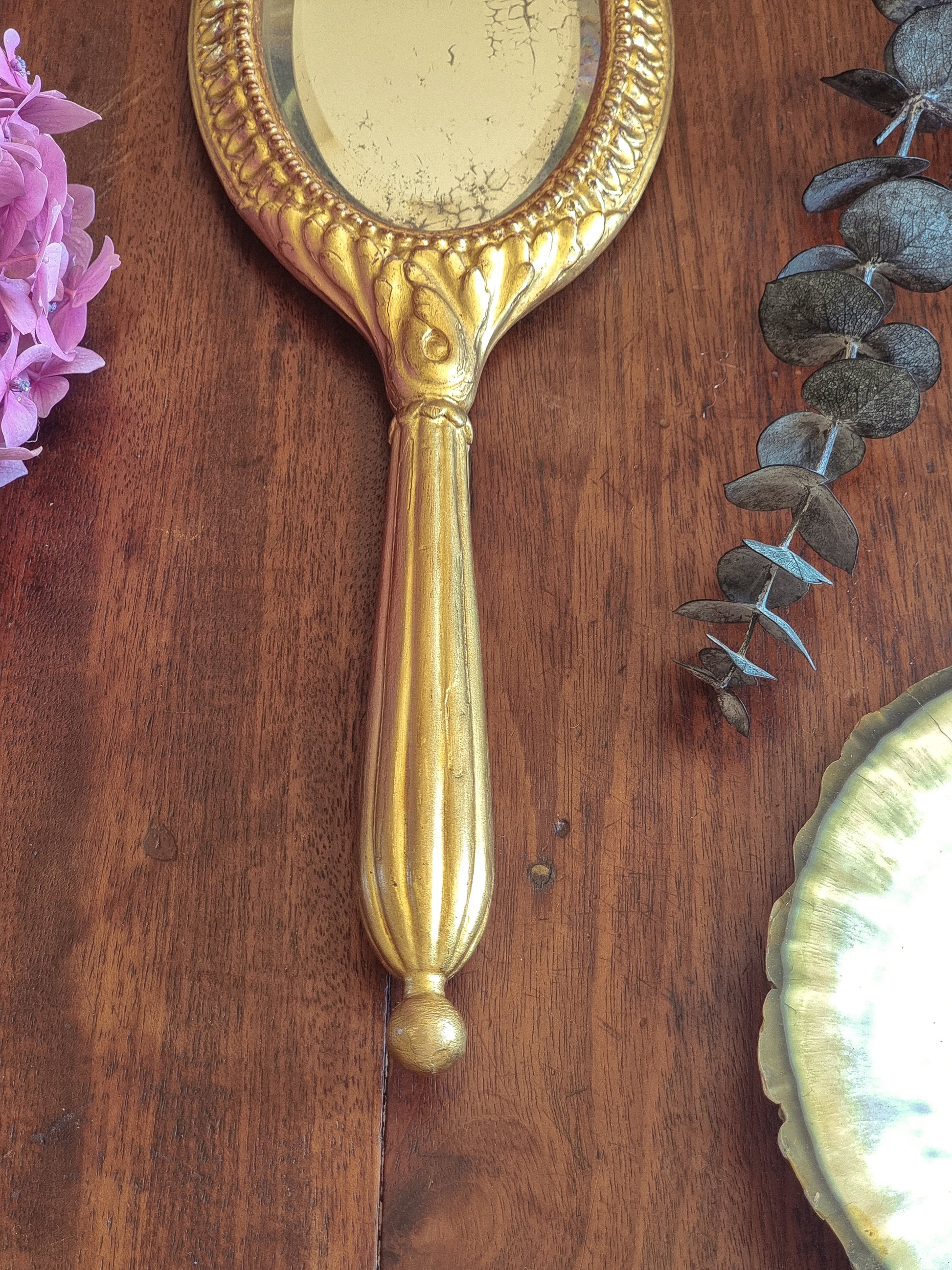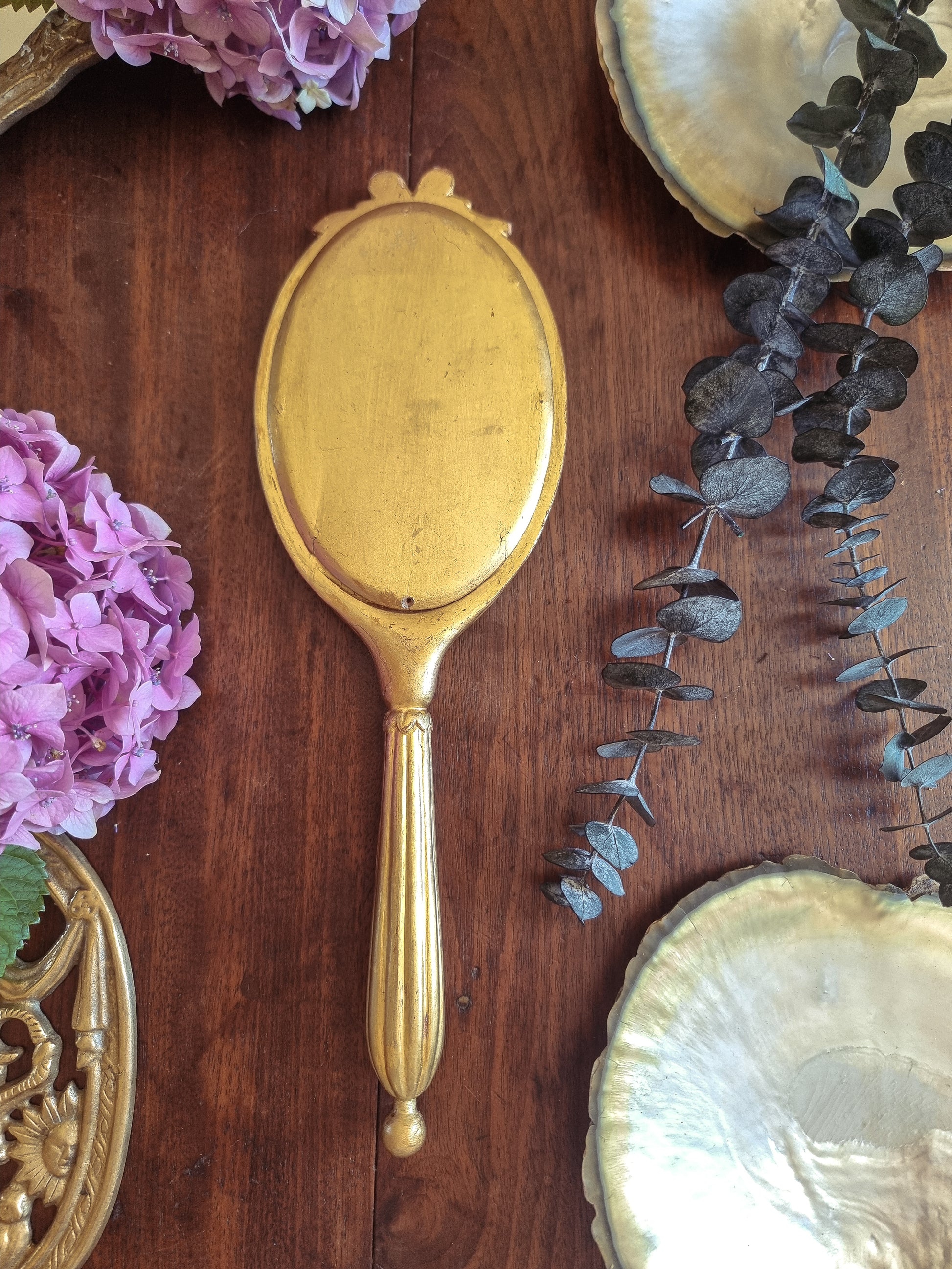 Superbe miroir à main en bois doré, glace piquée et biseautée.