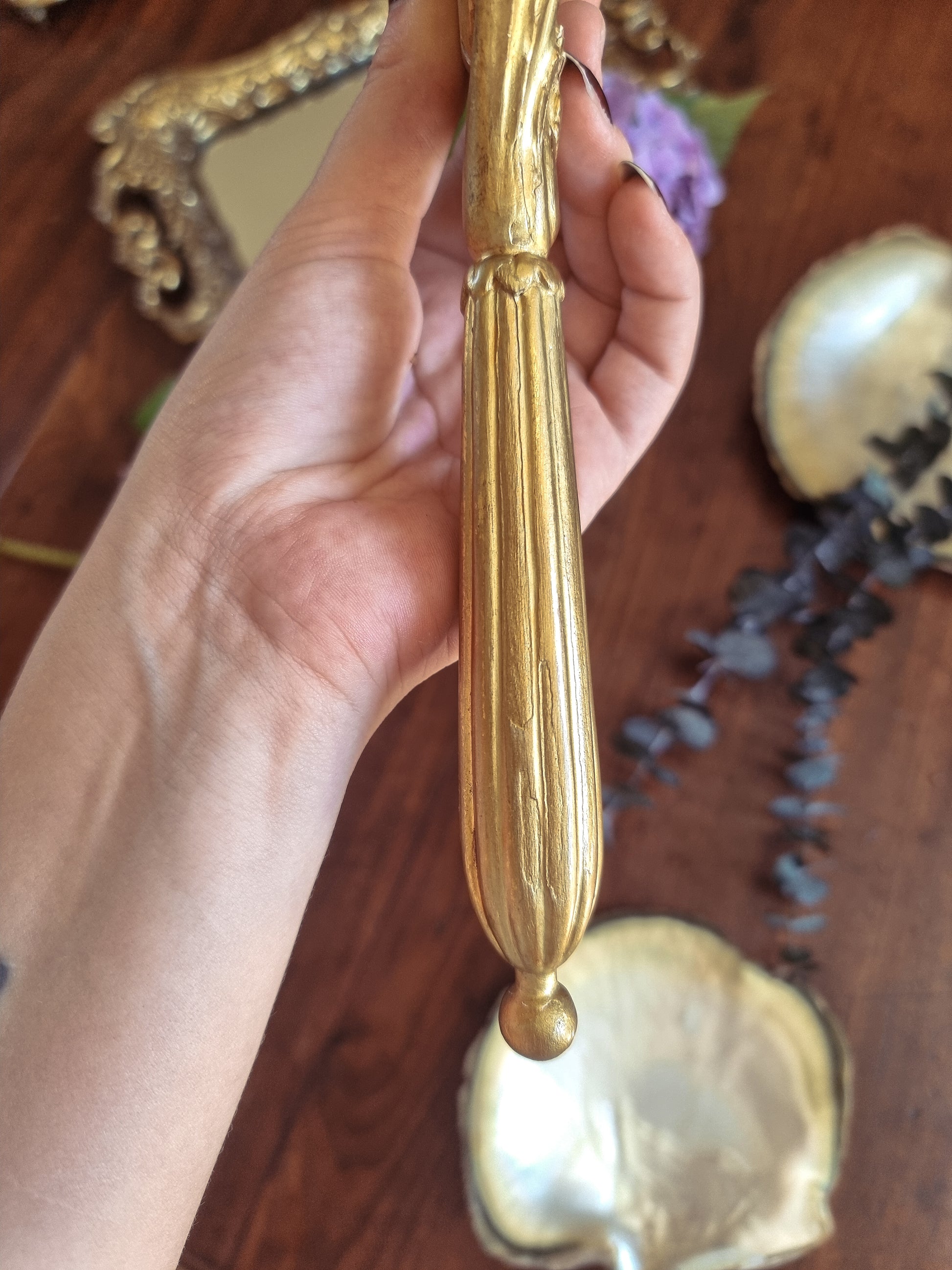 Le tout à été poncé et redoré avec plusieurs crème à dorer afin de garder la couleur initiale présente au niveau du cadre. Un vernis de protection à été appliqué.