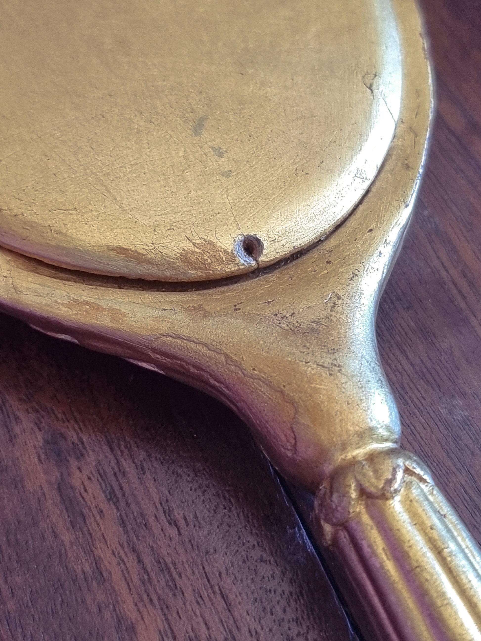 D'anciens manques sont présents sur le manche ainsi qu'à deux endroit sur le cadre et le noeud. La vis arrière n'a pas pu être remplacée, ne répondant pas aux tailles standard, la glace peut donc légèrement bouger si on secoue le miroir.