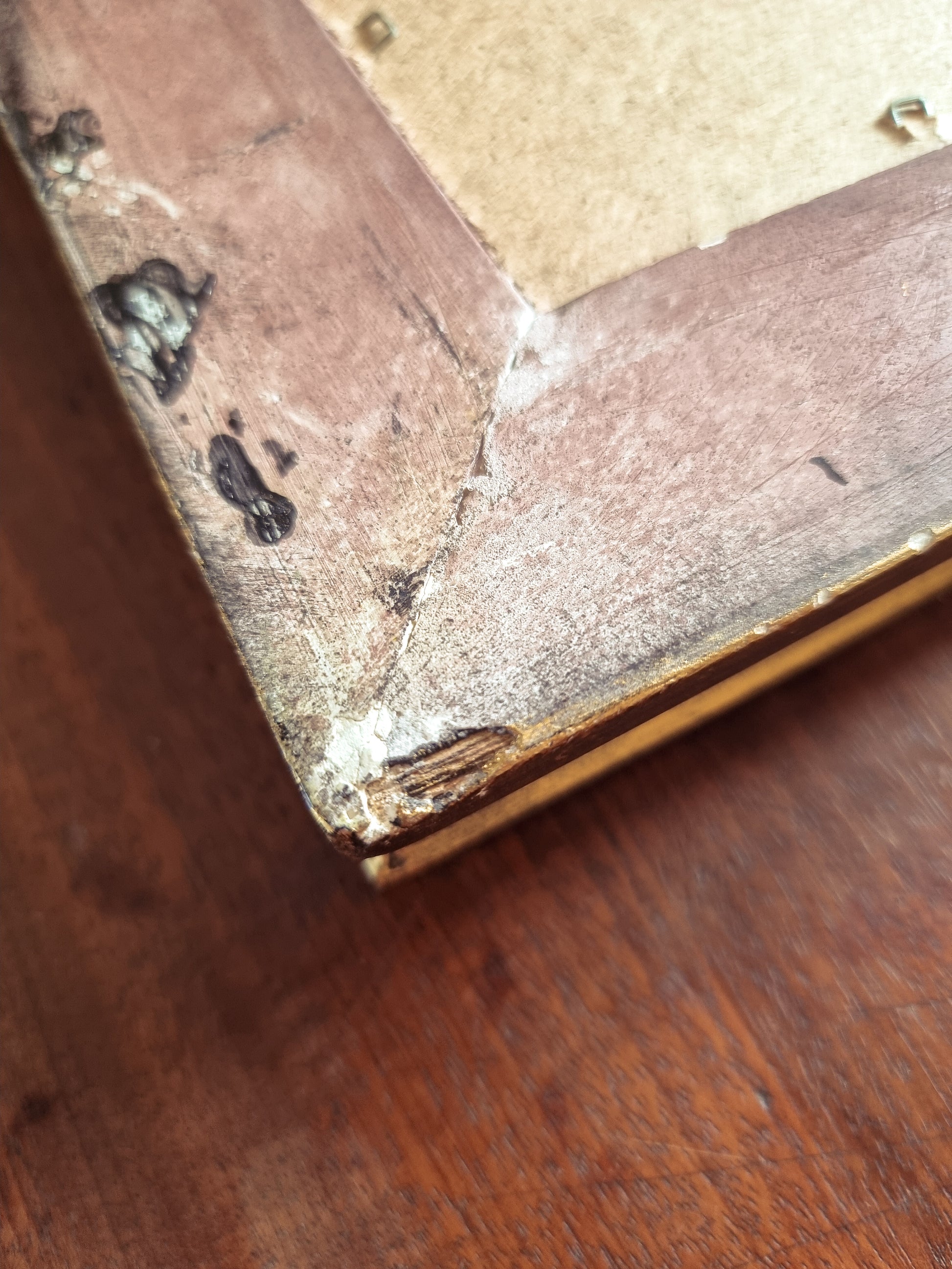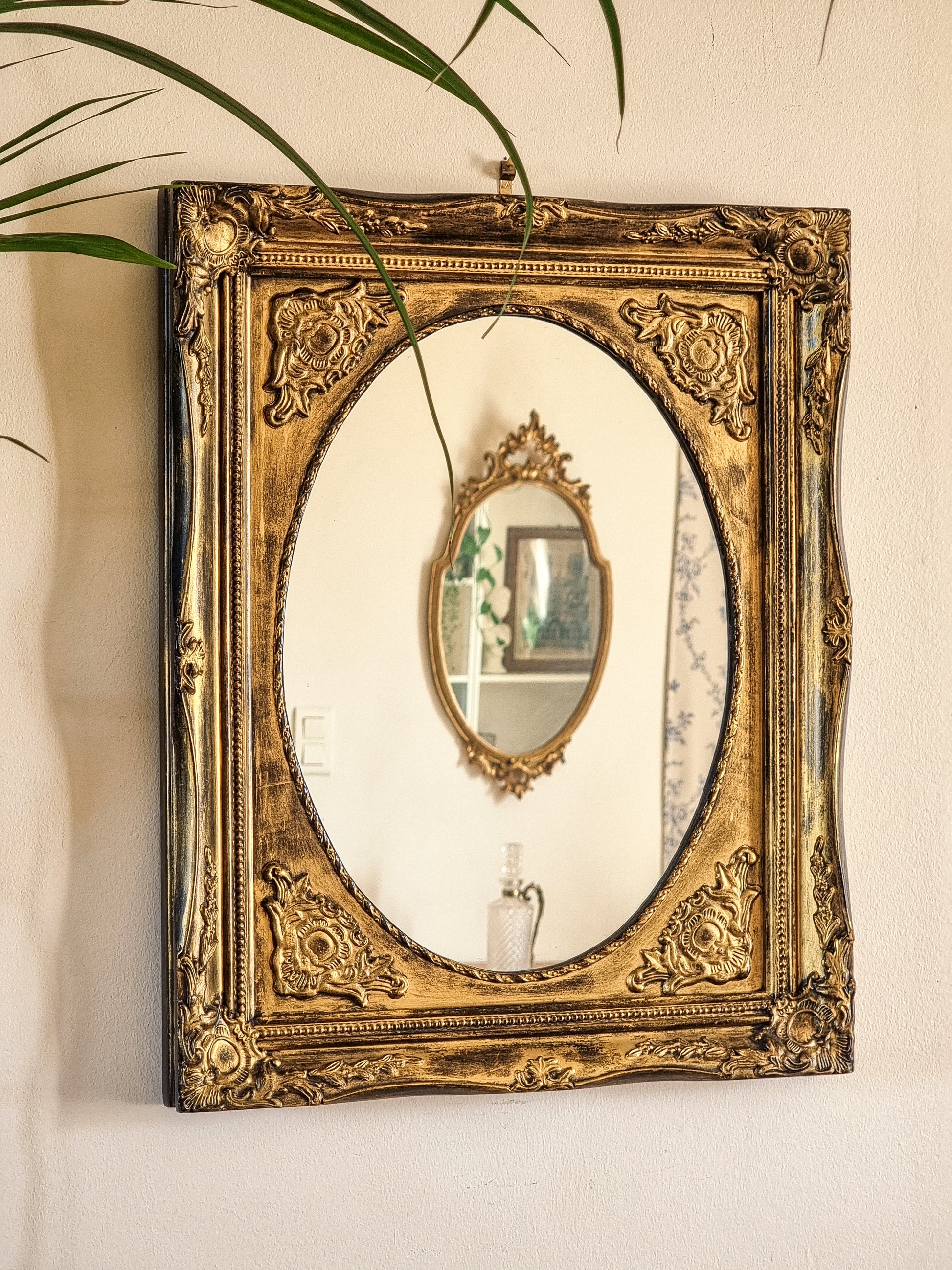Richement ornementé. Il s'agit à la base d'un miroir complètement noir. Il a été restauré avec de la crème à dorer afin de créer une patine pleine de charme.