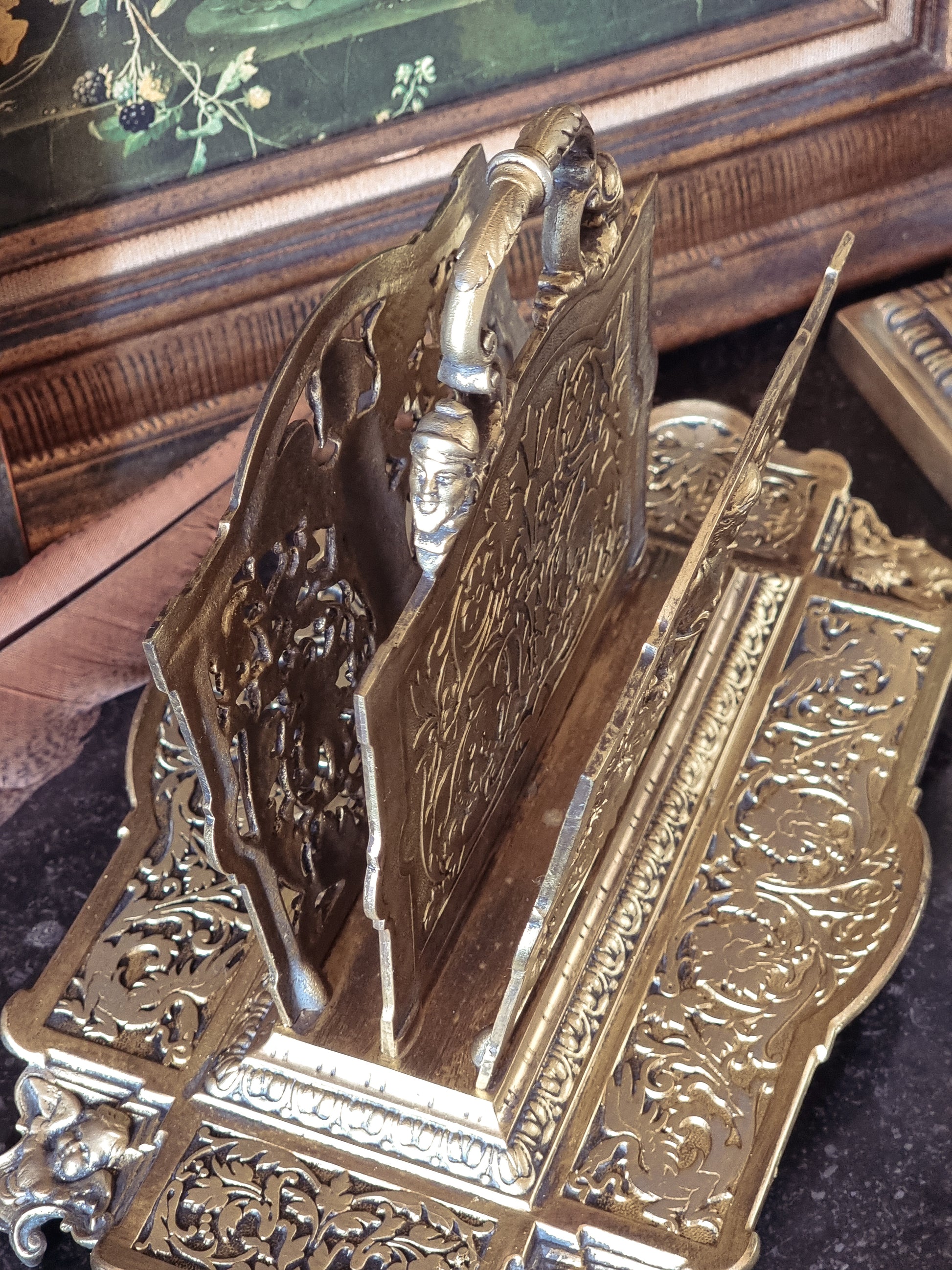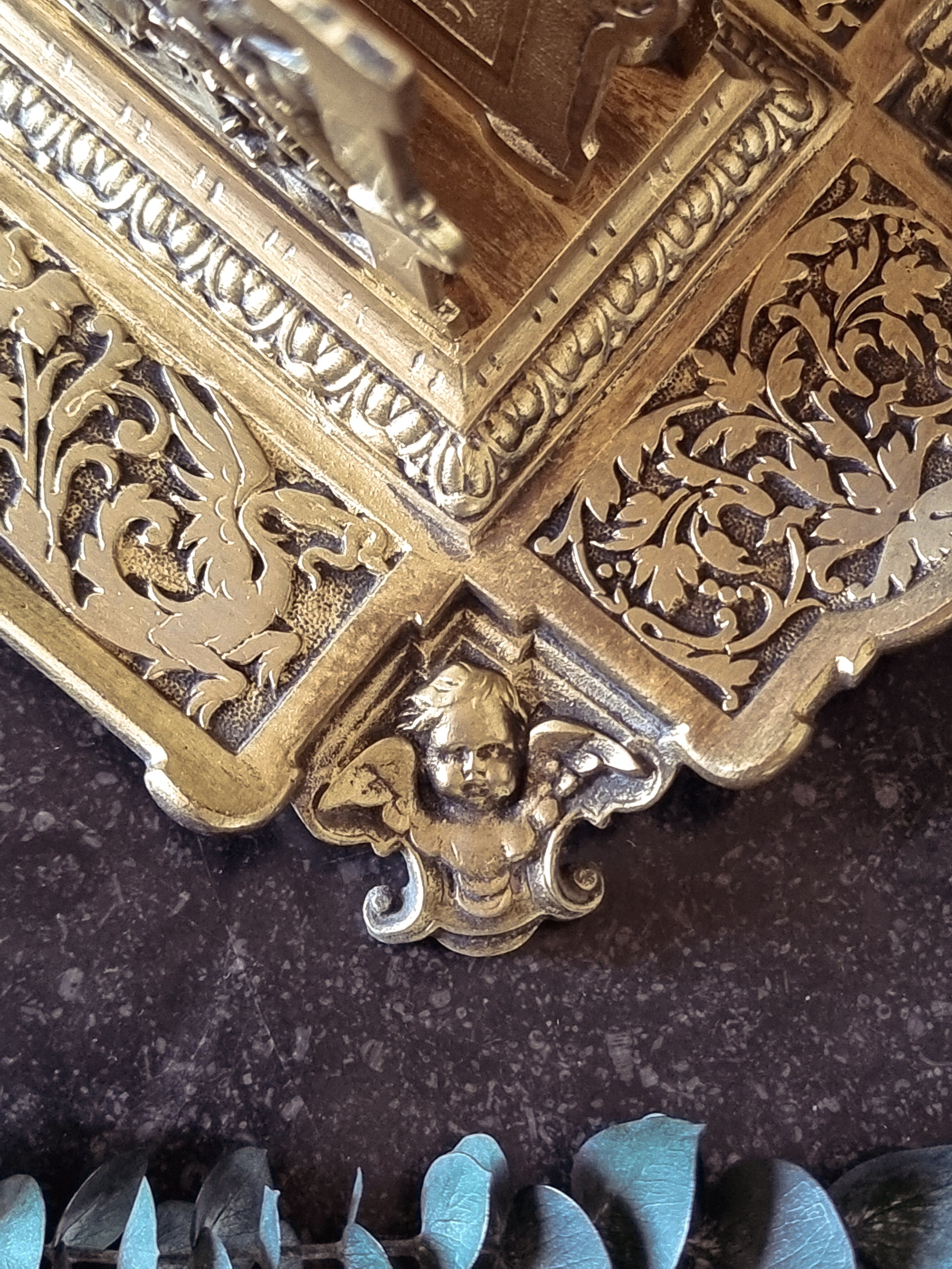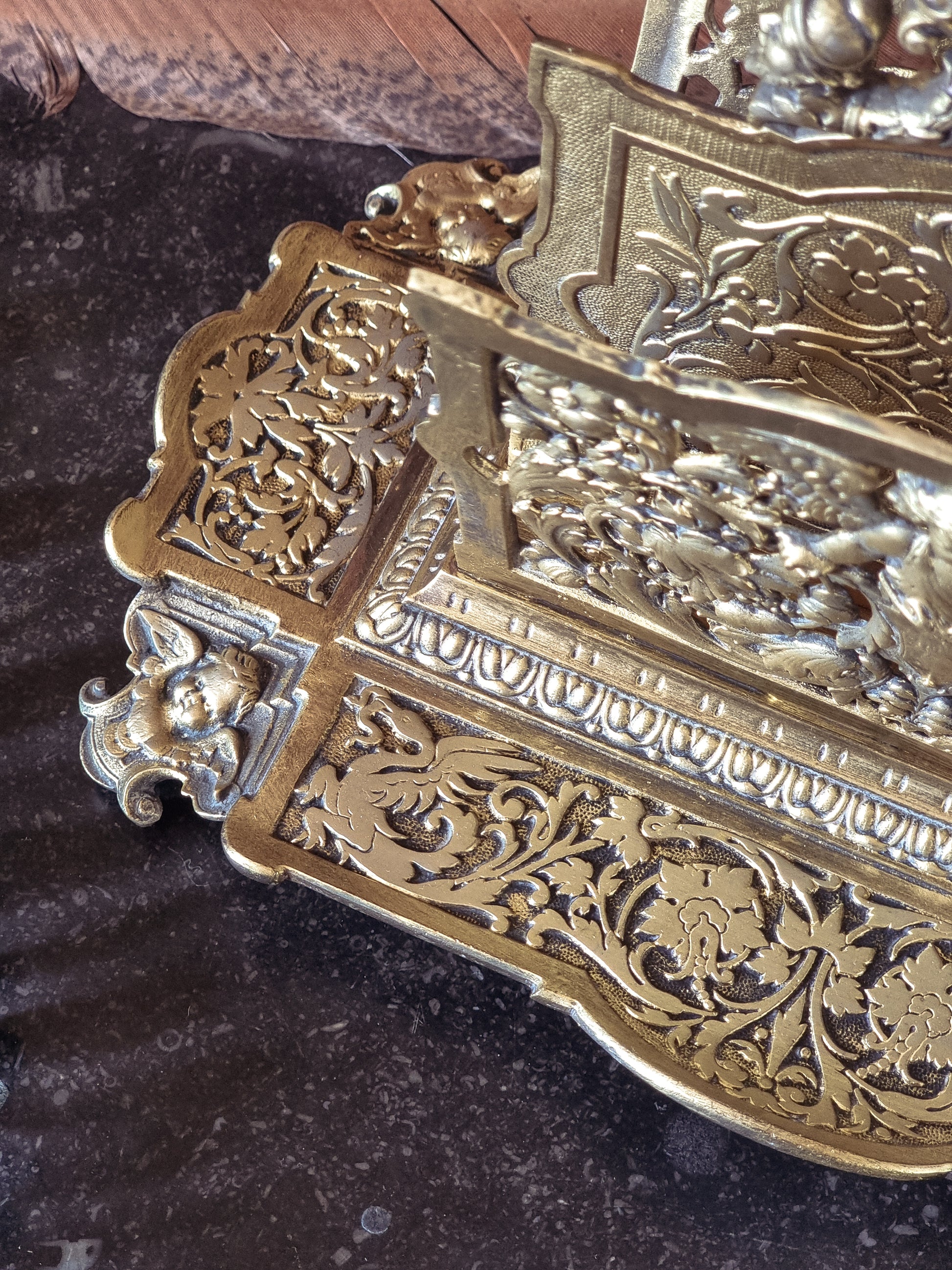 Il s'agit d'une pièce en fonte, restaurée avec de la crème à dorer pour lui donner un aspect de bronze légèrement patiné. Certains endroits sont plus dorés que d'autres pour garder un aspect naturel.