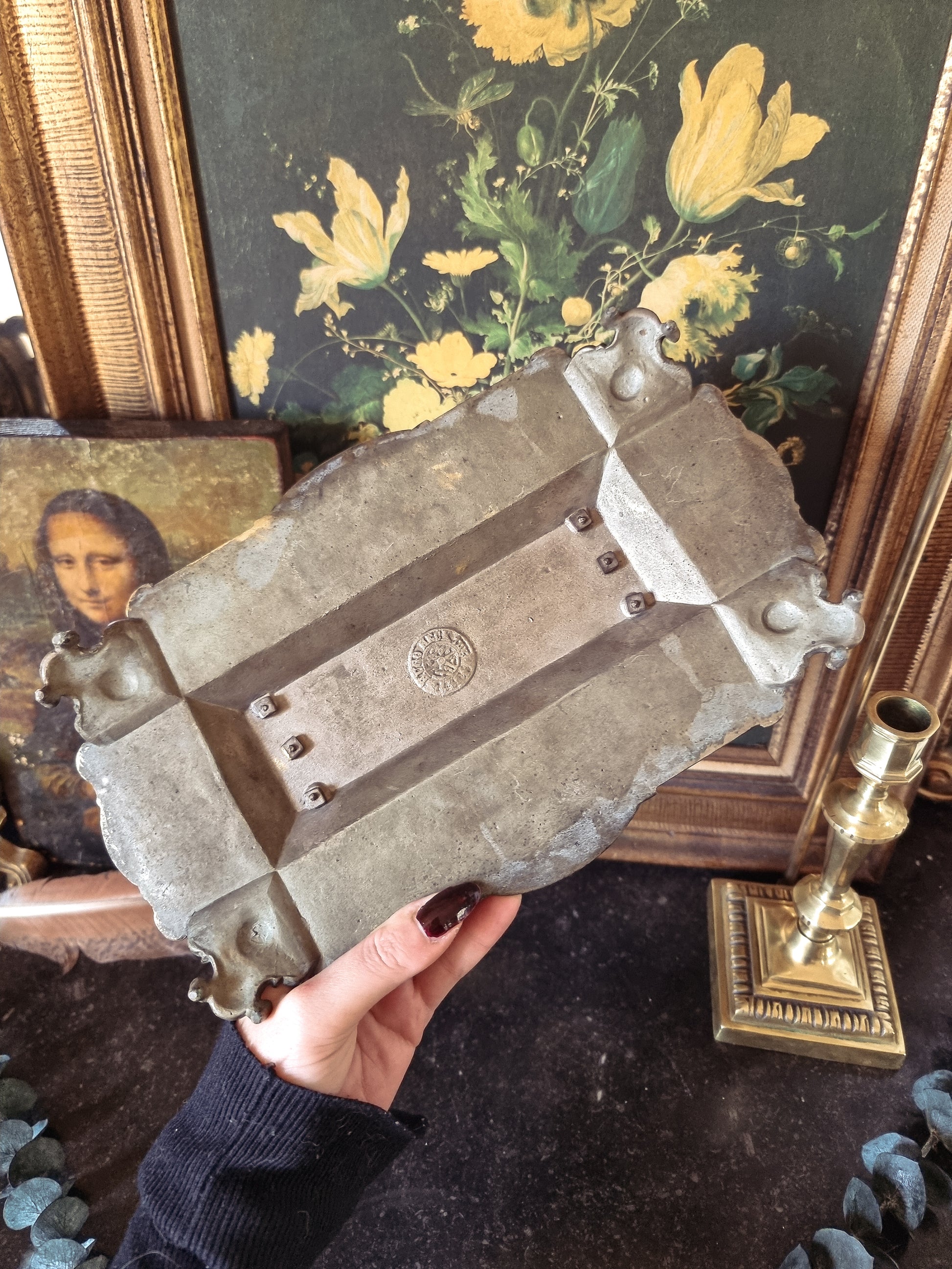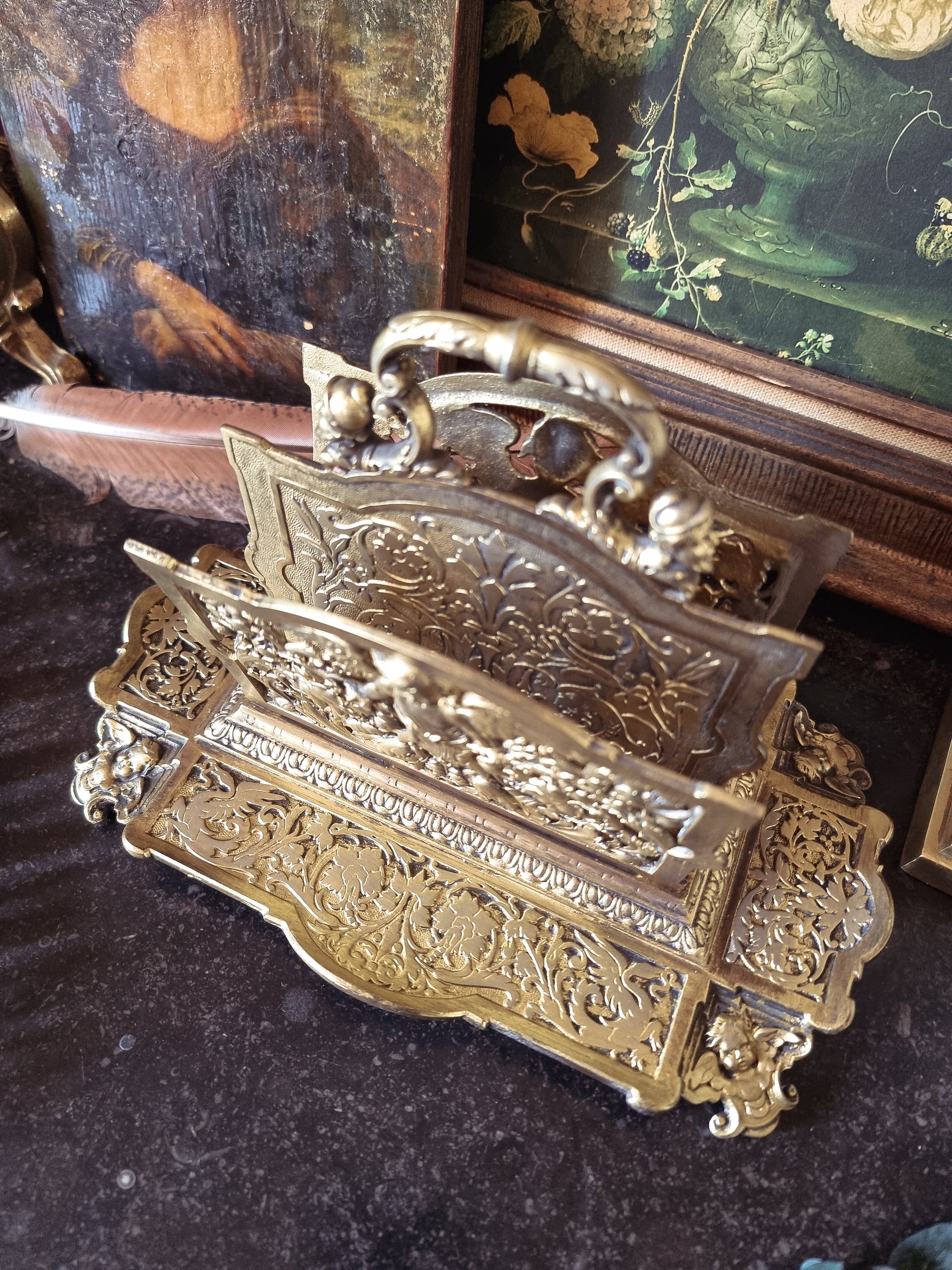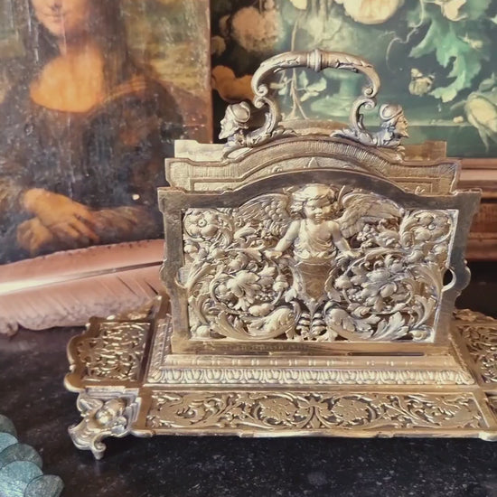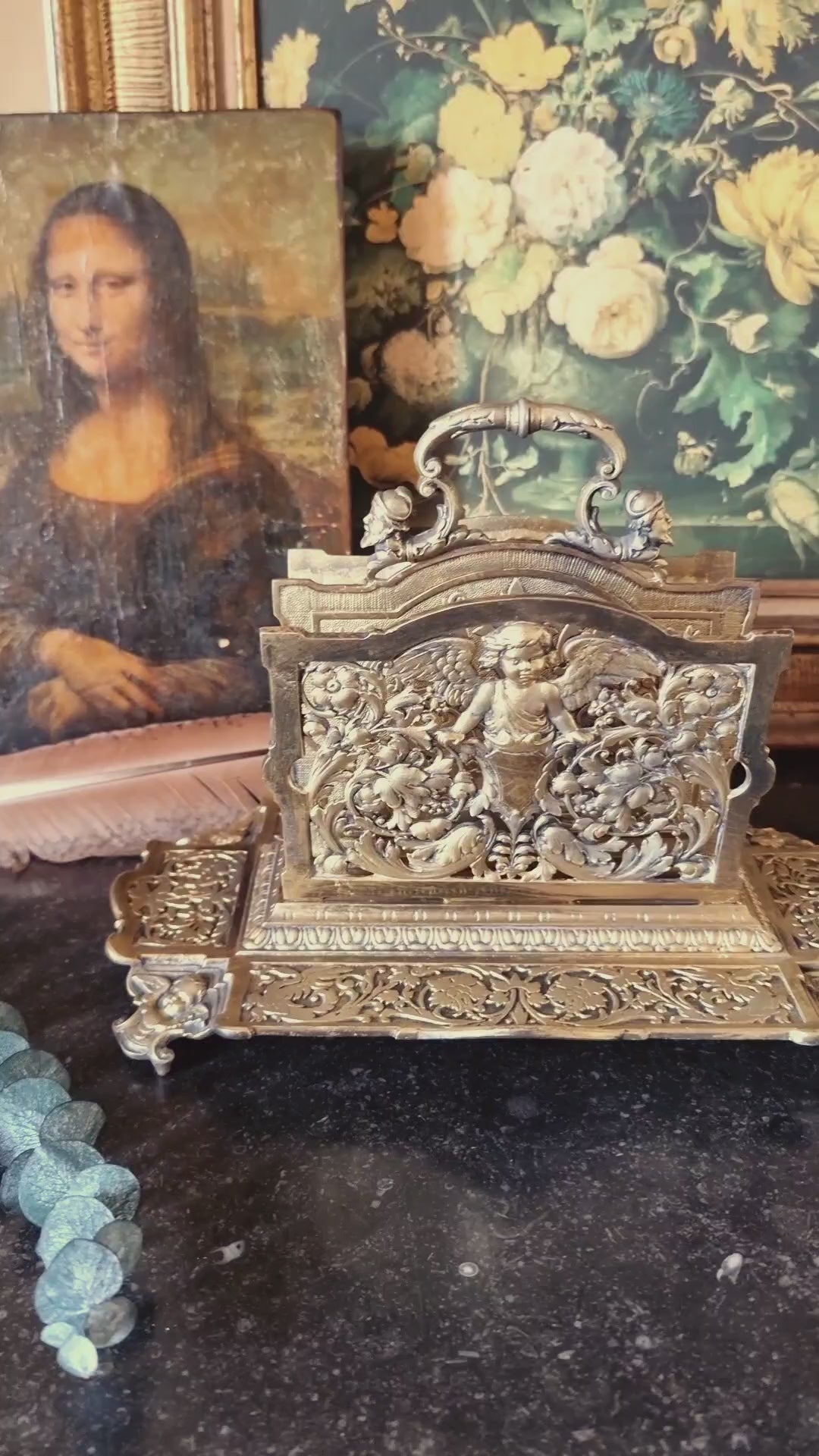 Il s'agit d'une pièce en fonte, restaurée avec de la crème à dorer pour lui donner un aspect de bronze légèrement patiné. Certains endroits sont plus dorés que d'autres pour garder un aspect naturel.