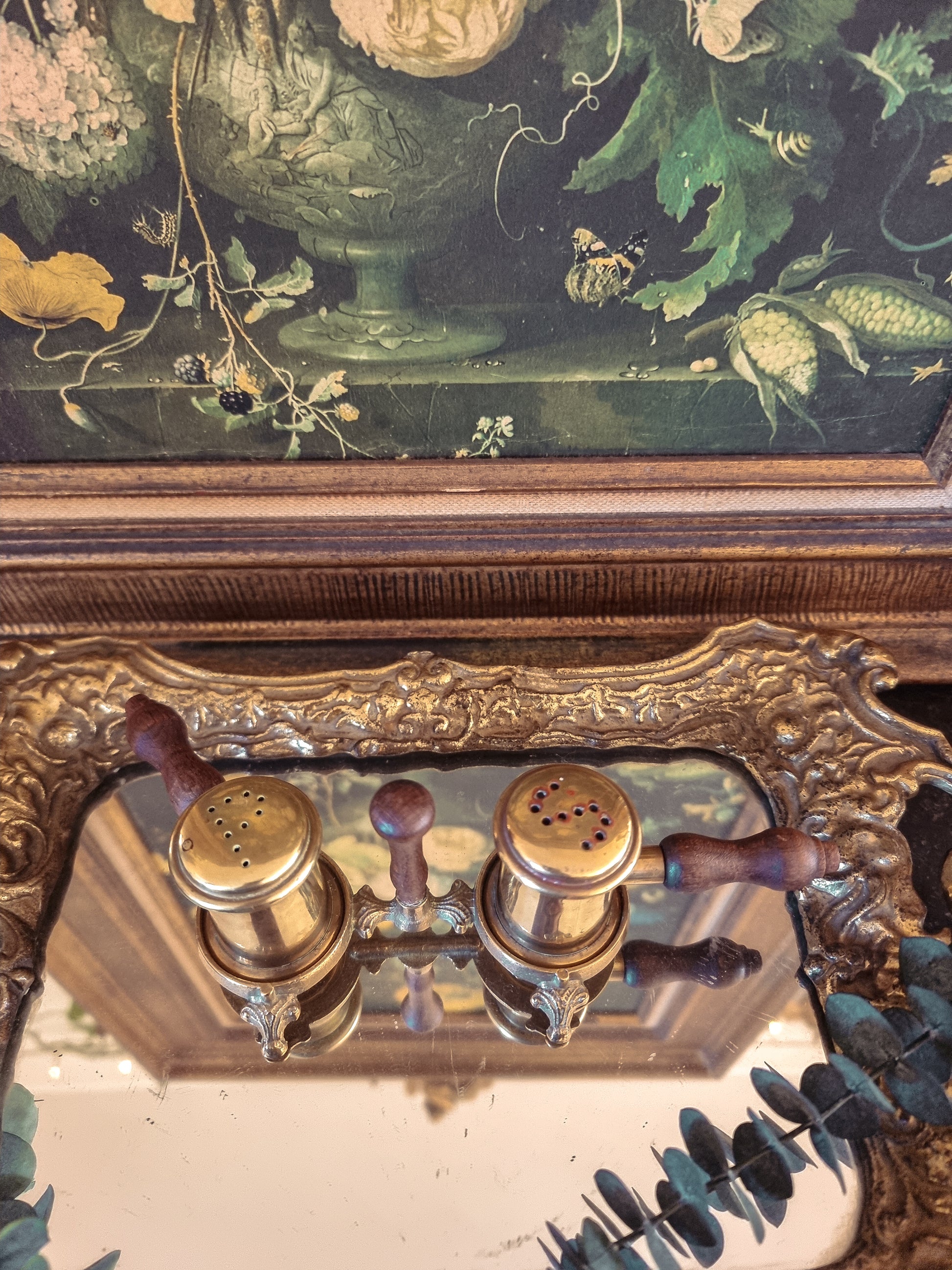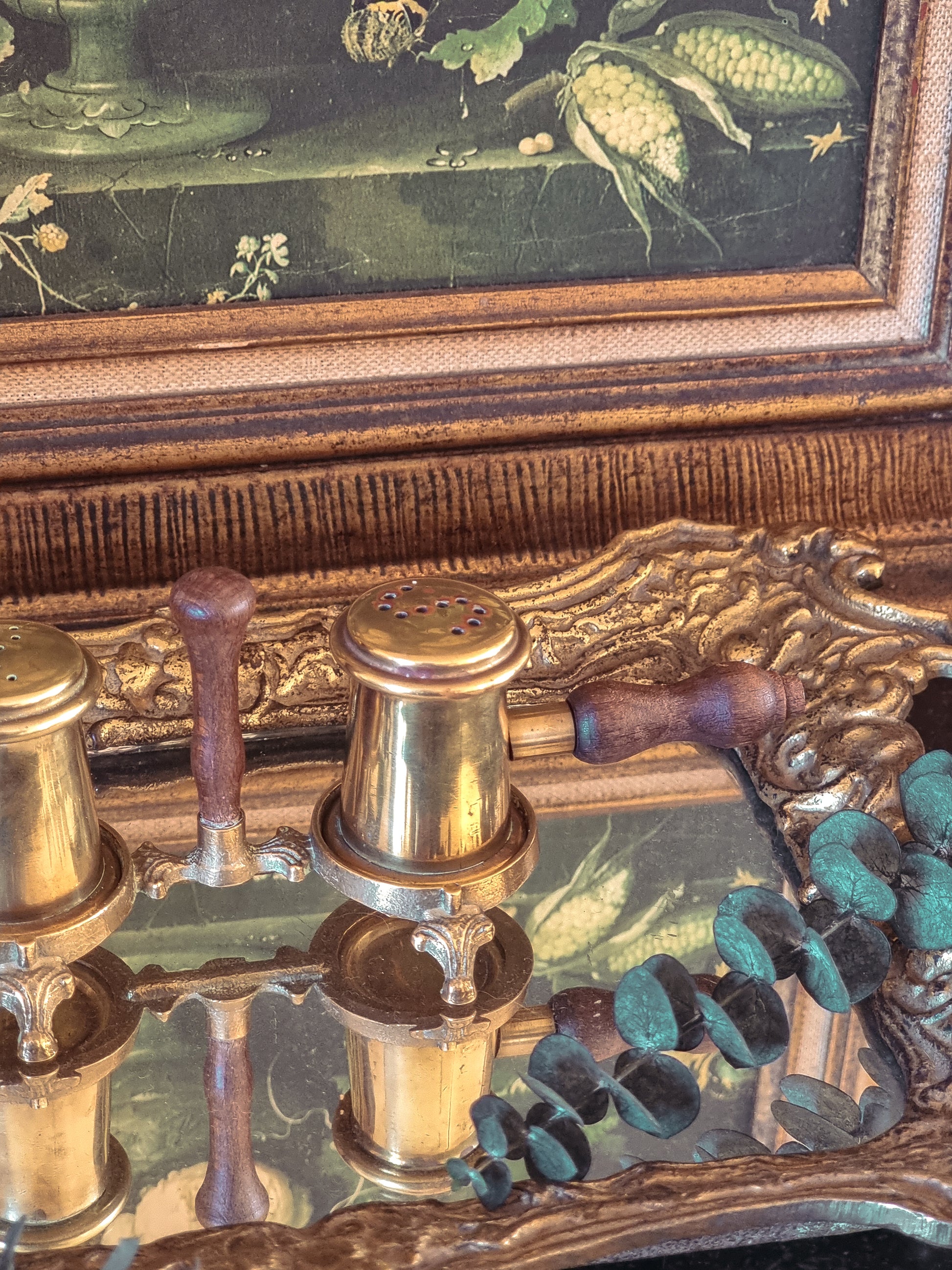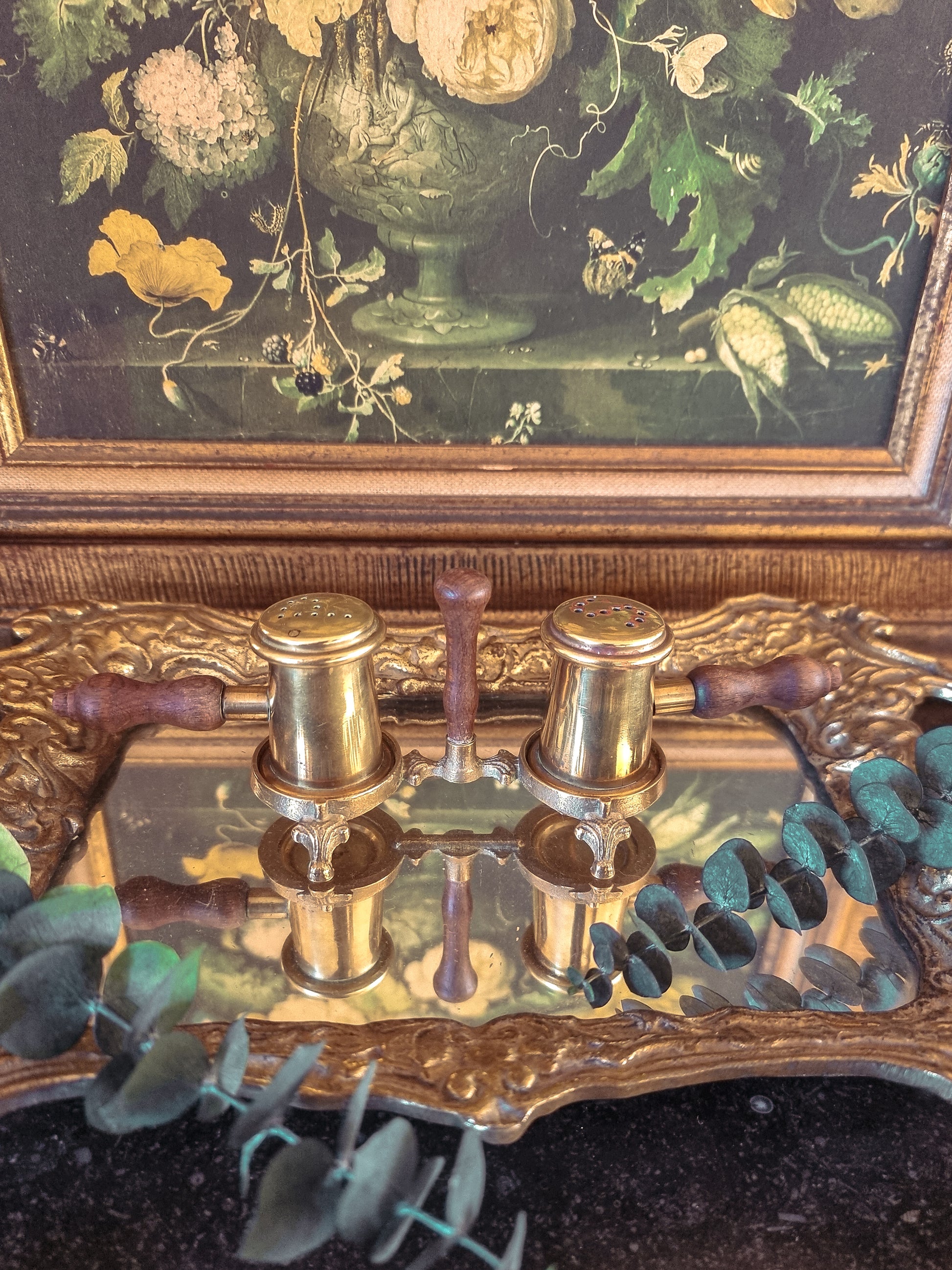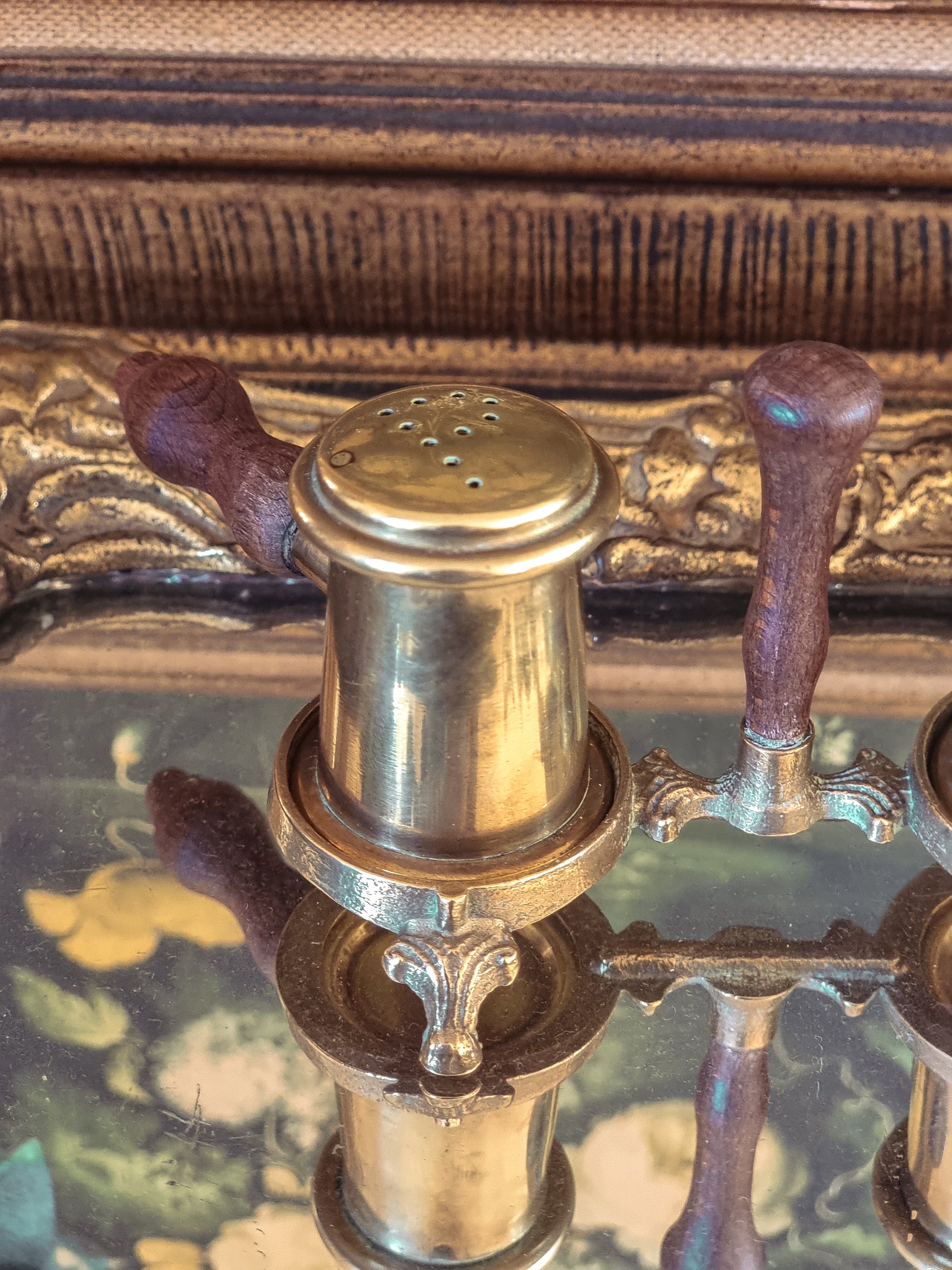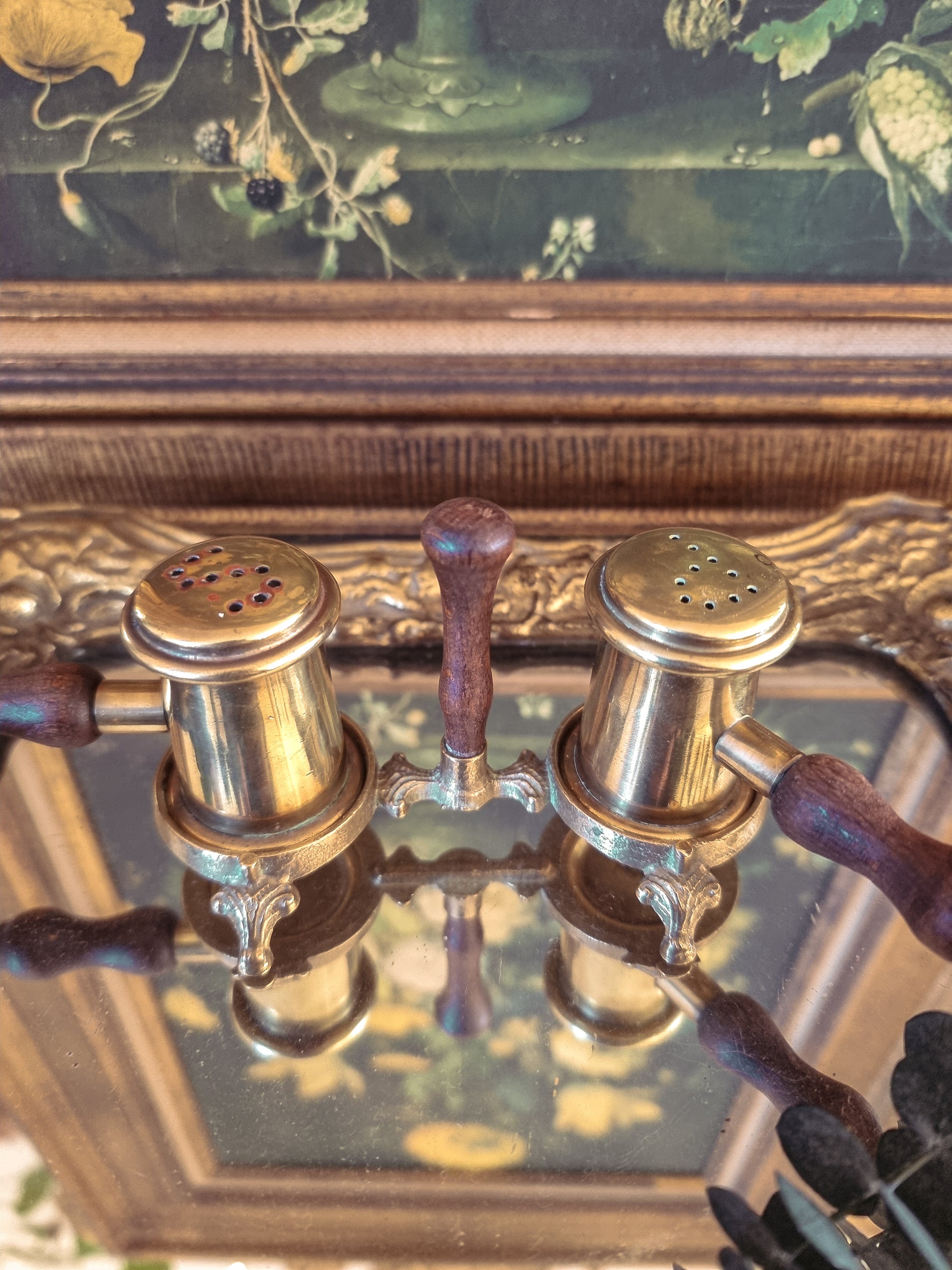 Jolie salière et poivrière en laiton avec ses poignées en bois, milieu du XXe siècle.