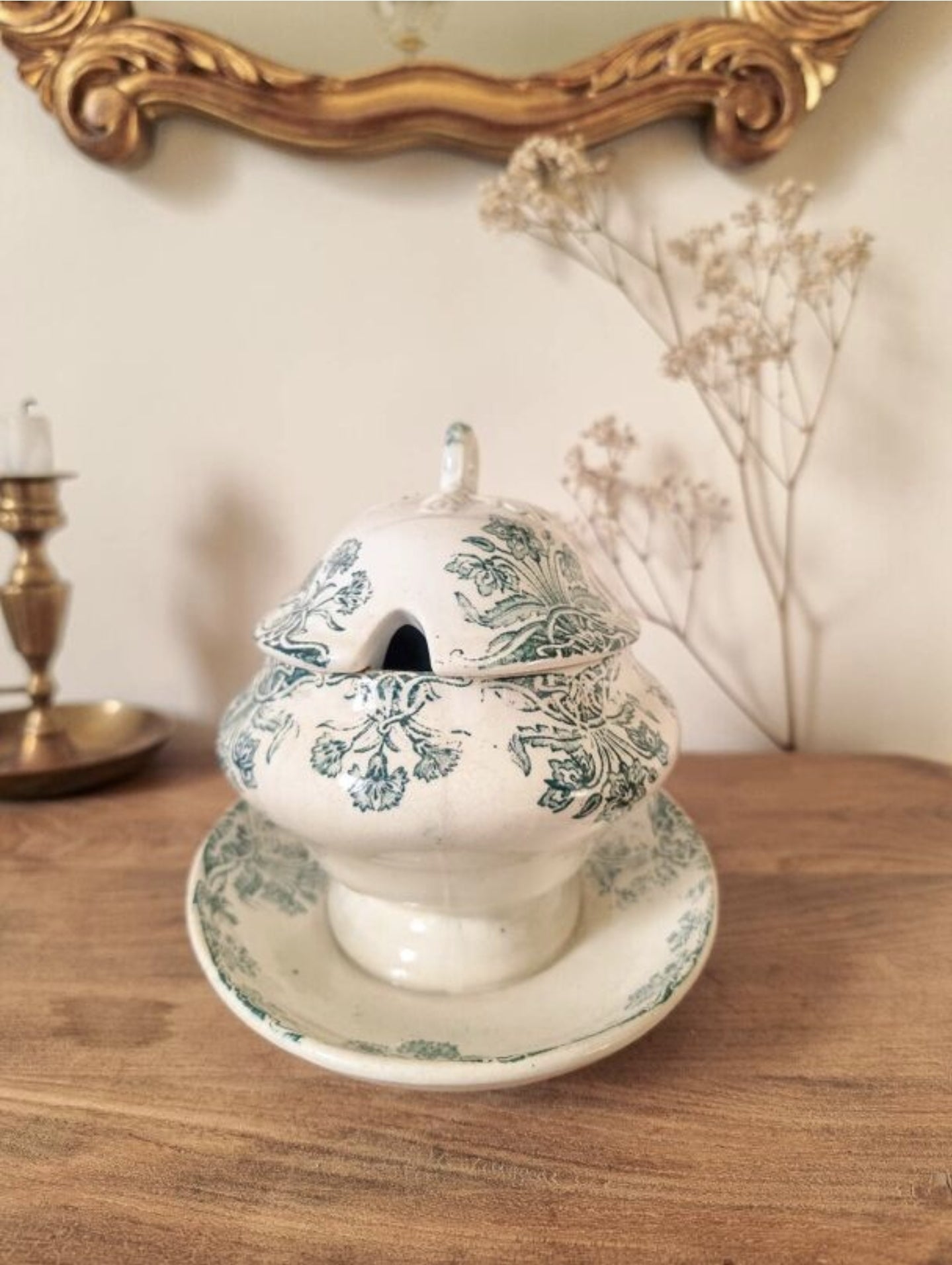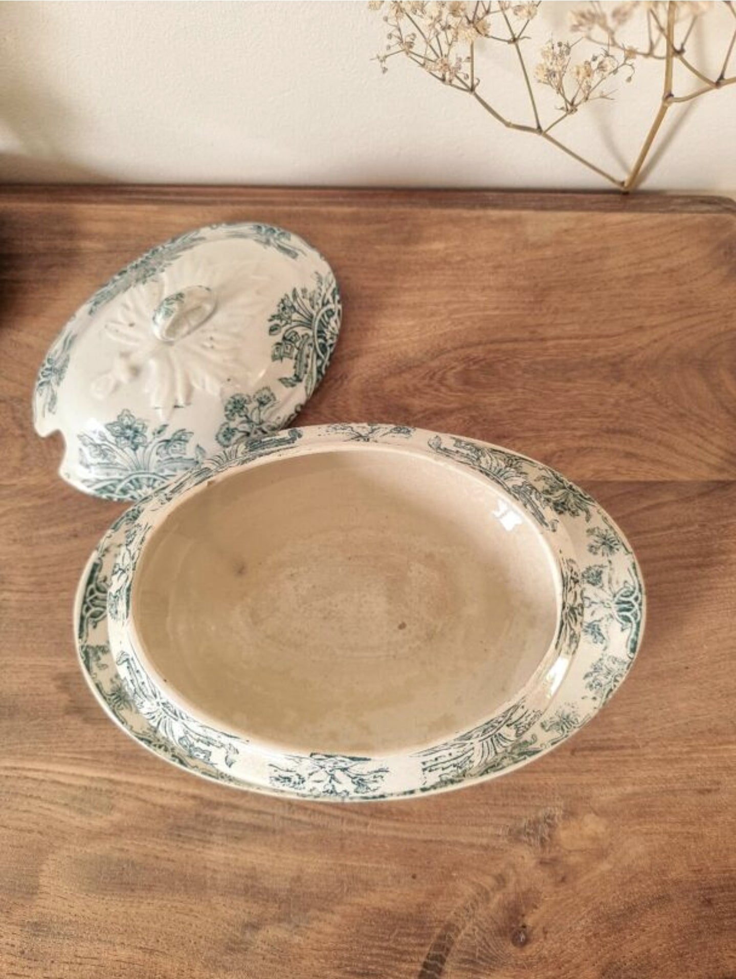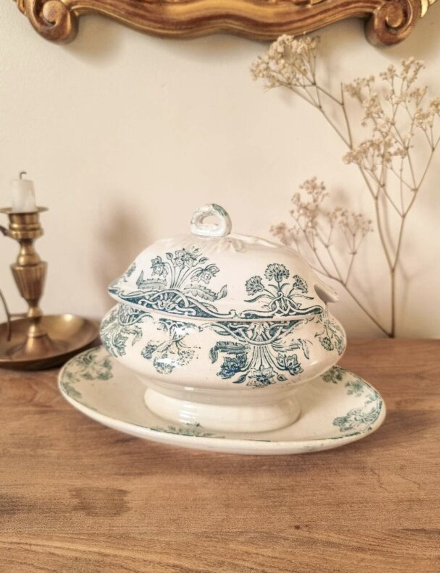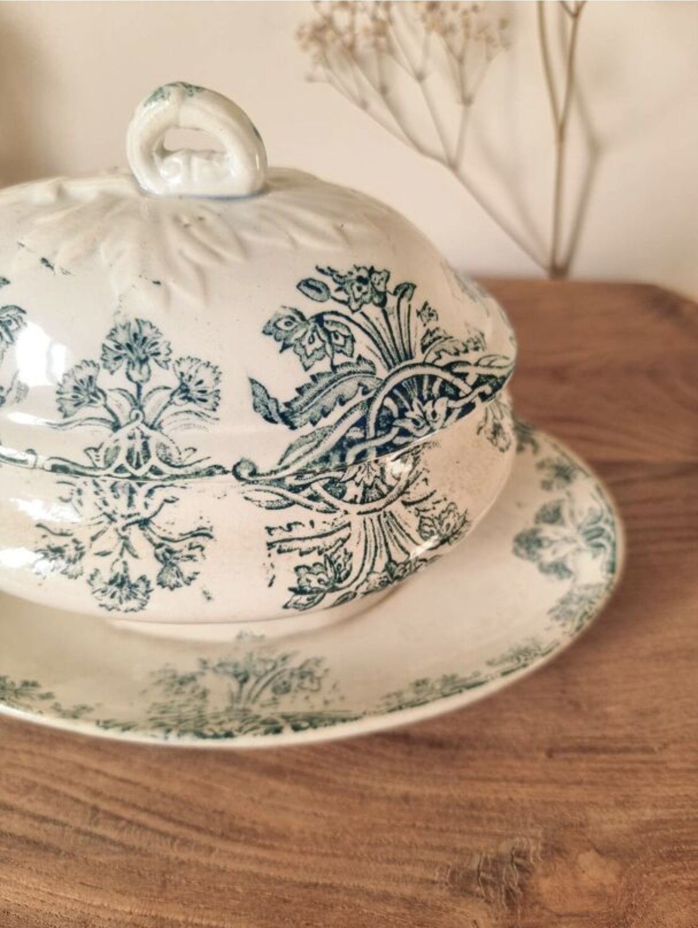 Très jolis motifs floraux, que ce soit sur le couvercle, le contenant ou encore le réceptacle, dans des teintes de bleu-vert.
