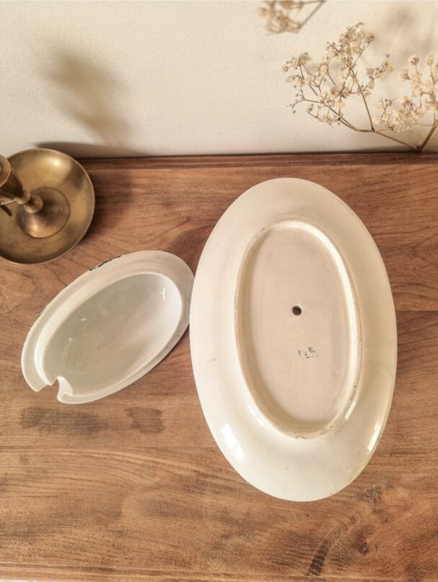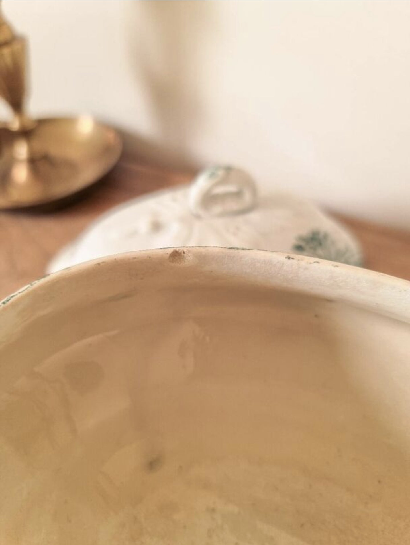 Traces du passé présentent : Léger choc sur le rebord intérieur de saucière, trace du temps à l'intérieur de la saucière.