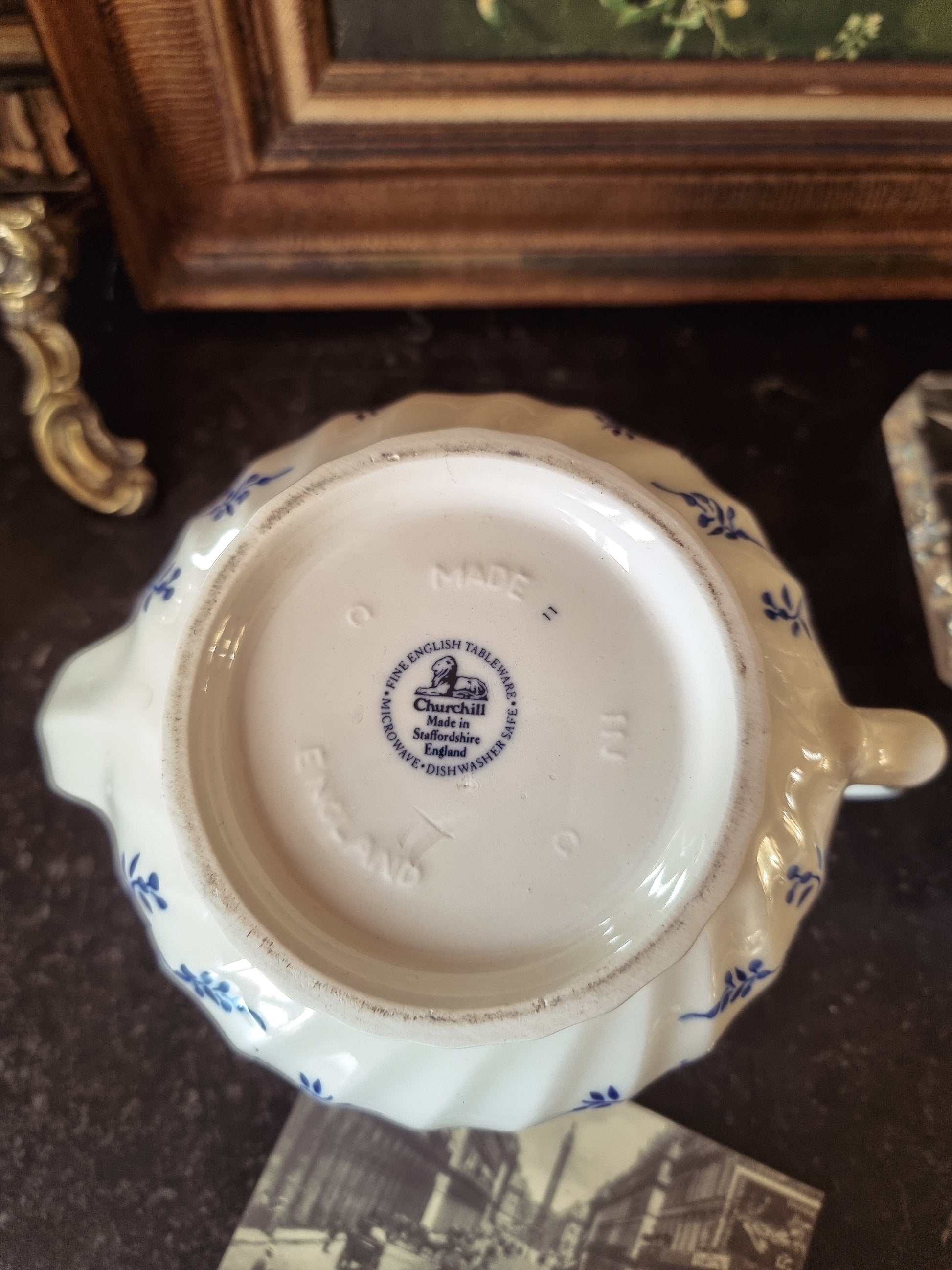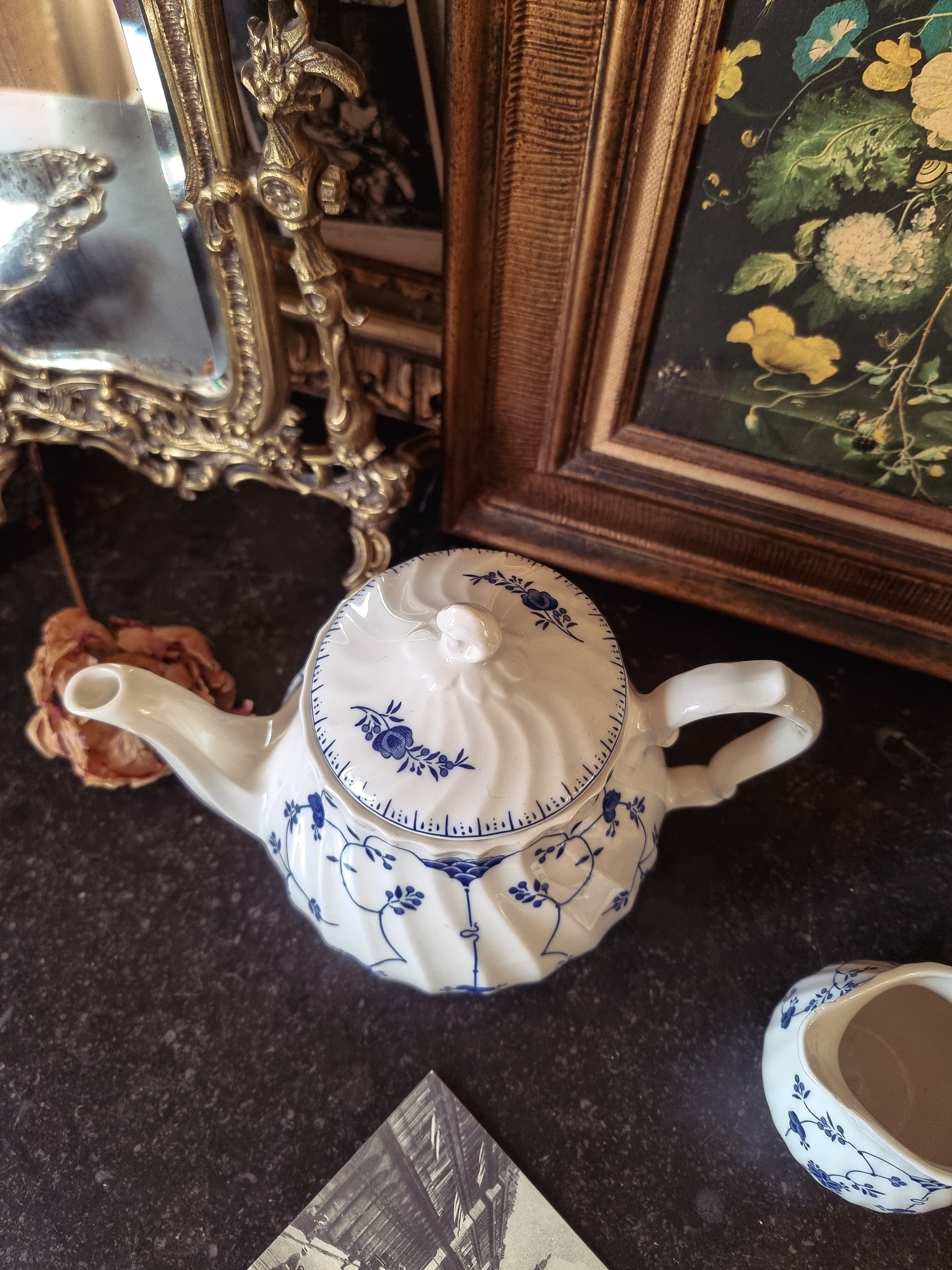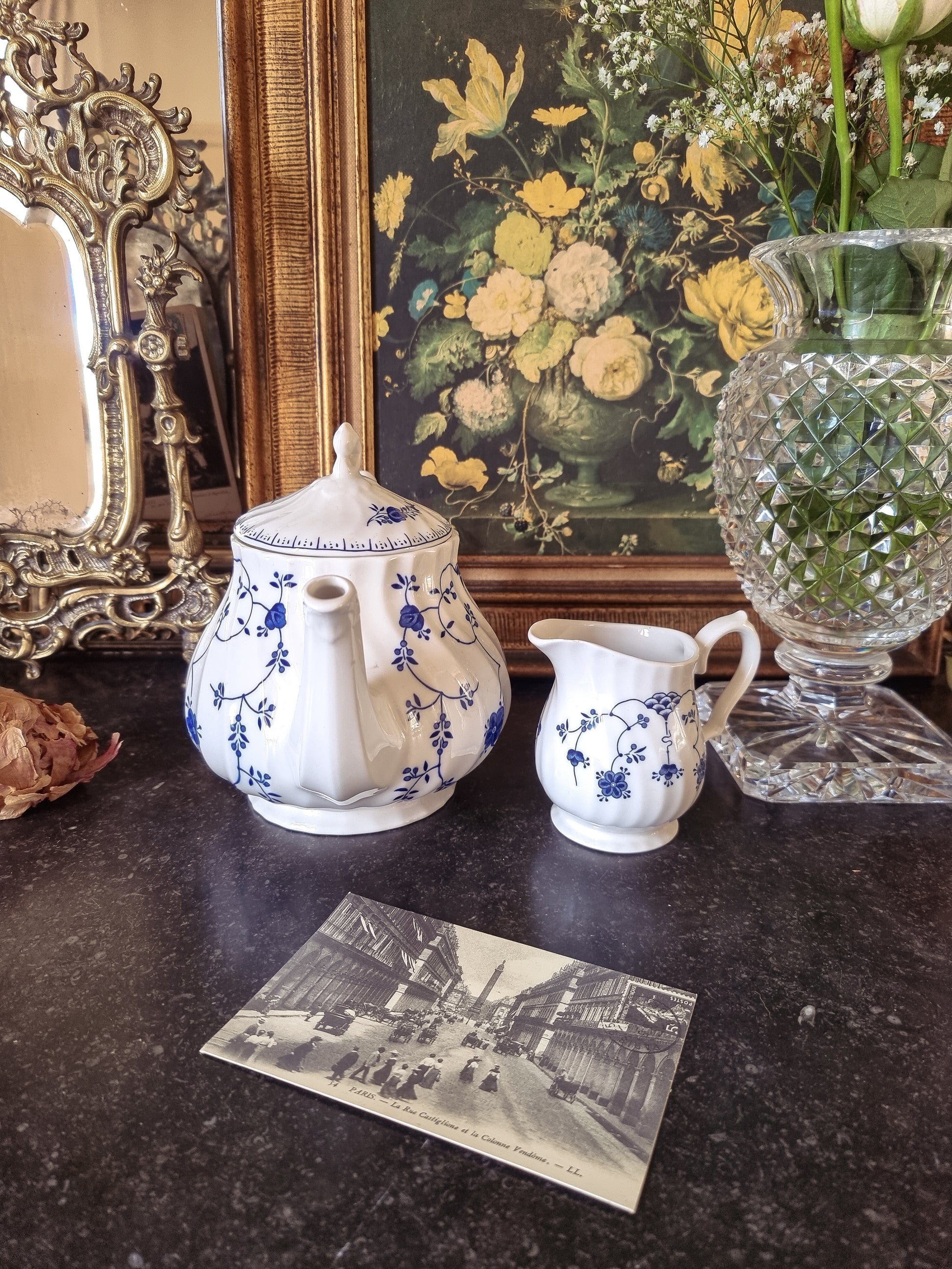 Sublime théière et son pot à lait, production anglaise par Churchill, modèle appelé Finlandia bleu/blanc. Vintage des années 1970.